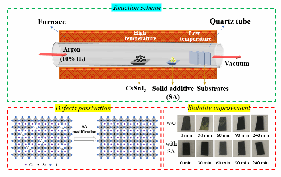 图1 SA-CVD制备过程、CsSnI3缺陷钝化机理及稳定性提升示意图