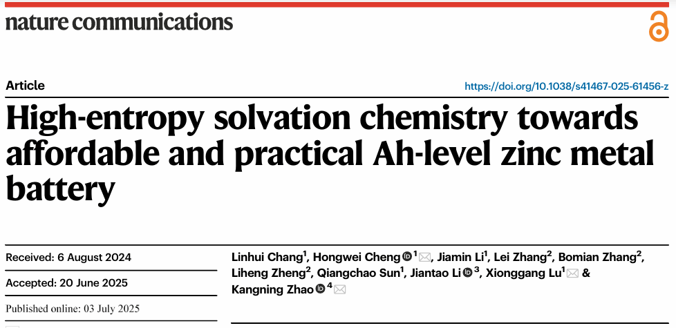 近日,Beat365唯一官方网站材料学院博士研究生常麟晖以第一作者在国际顶级期刊《Nature Communications》(自然·通讯)发表题为“High-Entropy Solvation Chemistry towards Affordable and Practical Ah-level Zinc Metal Battery”的研究论文。Beat365唯一官方网站为第一单位,Beat365唯一官方网站程红伟教授、鲁雄刚教授和大湾区大学赵康宁助理教授为共同通讯作者。