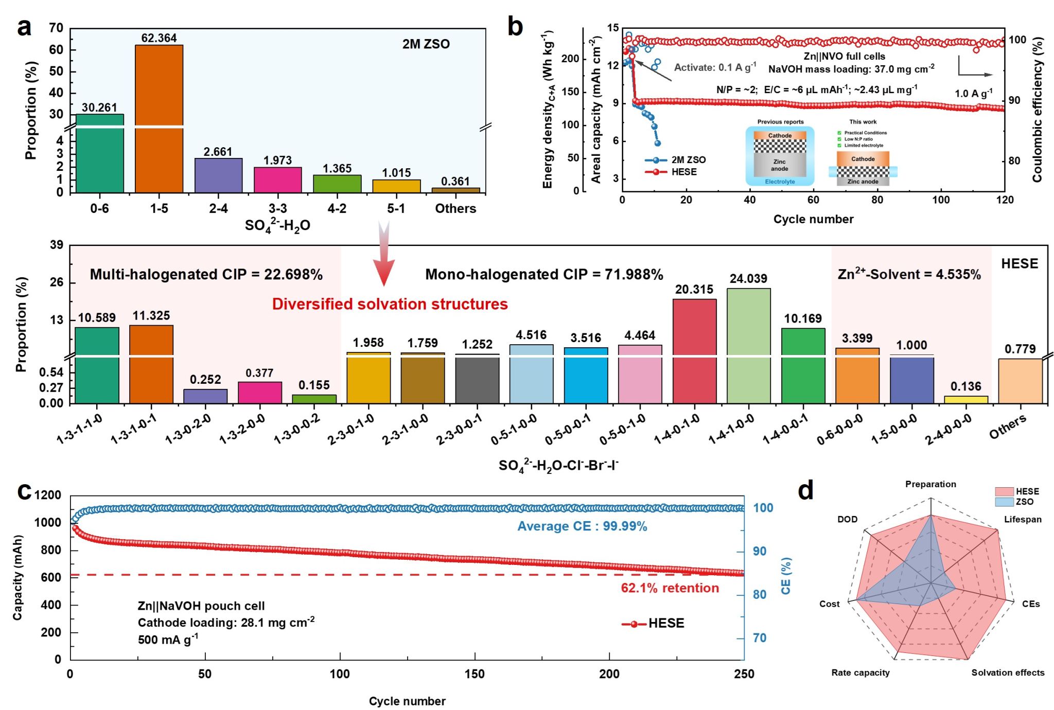 研究发现,在该高熵溶剂化电解质(HESE)中,由单卤素接触离子对(CIP, ~72%)与多卤素聚集体(AGG,~23%)共同构建的特殊溶剂化结构显著提高了体系的构型熵(从902.22提升至1172.43)。通过诱导溶剂化结构的精密重组,突破了多卤素聚集体脱溶剂能垒限制,打破了传统卤素电解质中过电位与库伦效率的权衡,实现了低过电位与超高平均库伦效率的协同提升。得益于此,基于HSES的锌金属电池展现出卓越的性能与广阔应用前景(图2)。全电池实现了9.23 mAh cm−2的面积容量和优异的循环稳定性,能量密度高达152.2 Wh kg−1,处于国际领先水平。作为规模化验证,Ah级软包电池在超过250次循环中展现出超高平均库伦效率(99.90%)。经核算,HESE成本约0.33 $·kg−1,与2M ZnSO4电解质(0.32 $·kg−1)相当,较传统高浓度/添加剂体系降本10倍以上。本论文提出的高熵策略,通过精确调控阴-阳离子相互作用,为设计兼具高性能、高安全和低成本的实用化水系金属电池电解质开辟了新途径。