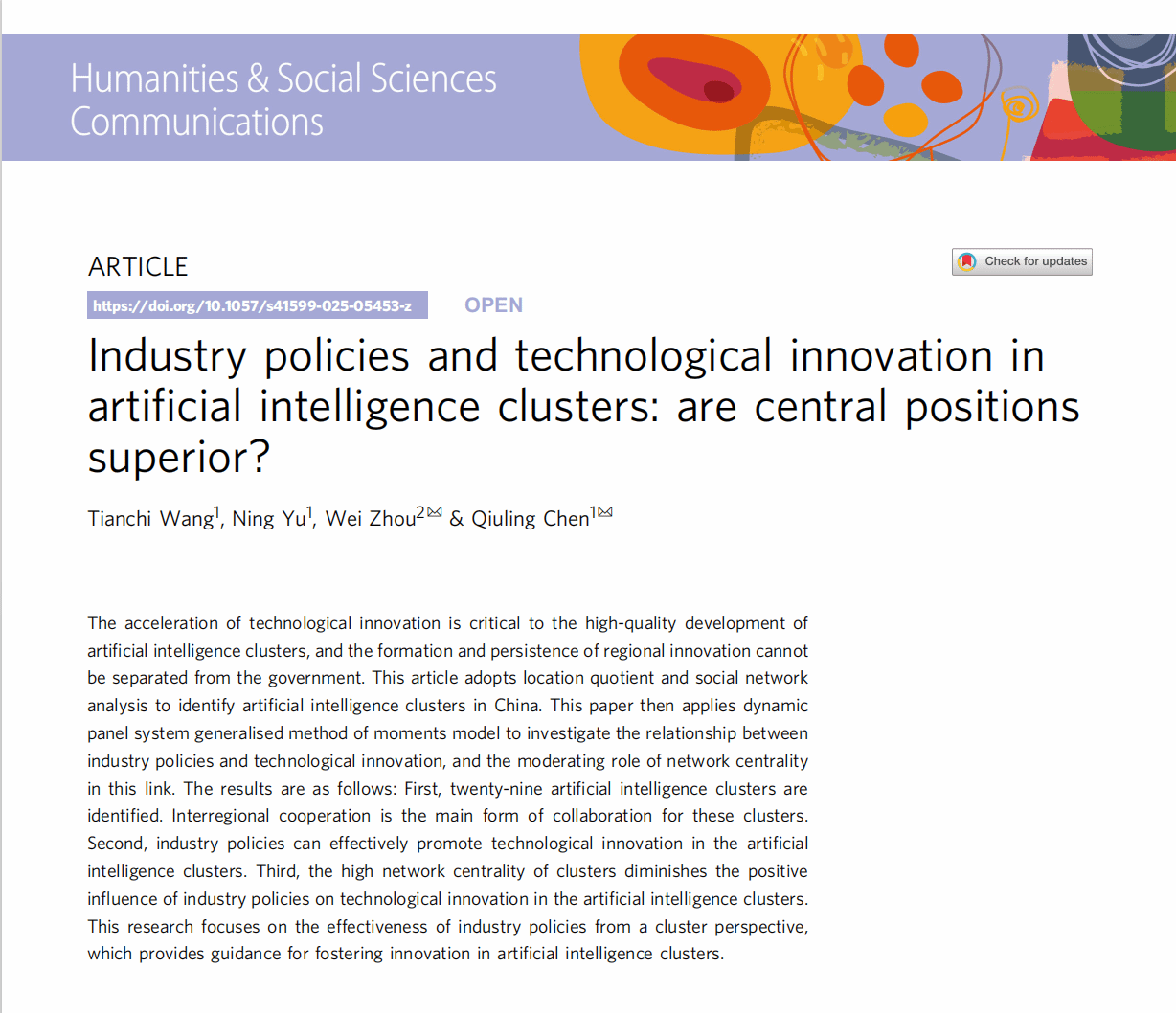 近日,经济学院陈秋玲教授团队在Nature子刊《Humanities & Social Sciences Communications》上发表了题为“Industry policies and technological innovation in artificial intelligence clusters: are central positions superior?”的学术论文。Beat365唯一官方网站为唯一单位,王天驰博士后为第一作者,硕士生余宁为第二作者,周炜博士和陈秋玲教授为共同通讯作者。《Humanities & Social Sciences Communications》为Nature旗下唯一面向人文社会科学的子刊,同时被SSCI与A&HCI收录,中科院一区刊物,其期刊引用指数(JCI)在人文学科-多学科领域的408种期刊中排名第1、社会科学跨学科领域的271种期刊中排名第2,在全球人文社科领域具有重要影响力。