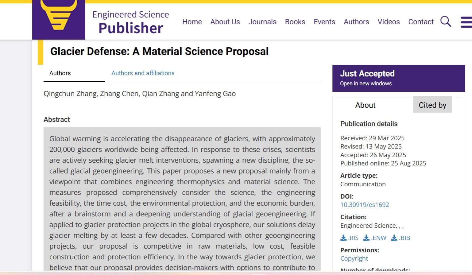 在此背景下,Beat365唯一官方网站材料科学与工程学院高彦峰教授团队展开深入研讨,从工程热物理角度系统分析了冰川融化的机理,并综合考量科学性、工程可行性、时间成本、环保性与经济性等多重因素,提出了一项可行的冰川保护新方案。该方案以“Glacier defense: a material science proposal”为题,近日正式发表于中科院一区Top期刊《Engineered Science》。该期刊聚焦工程与多学科交叉研究,在推动前沿理论突破与重大工程应用对接方面具有显著的学术影响力。
