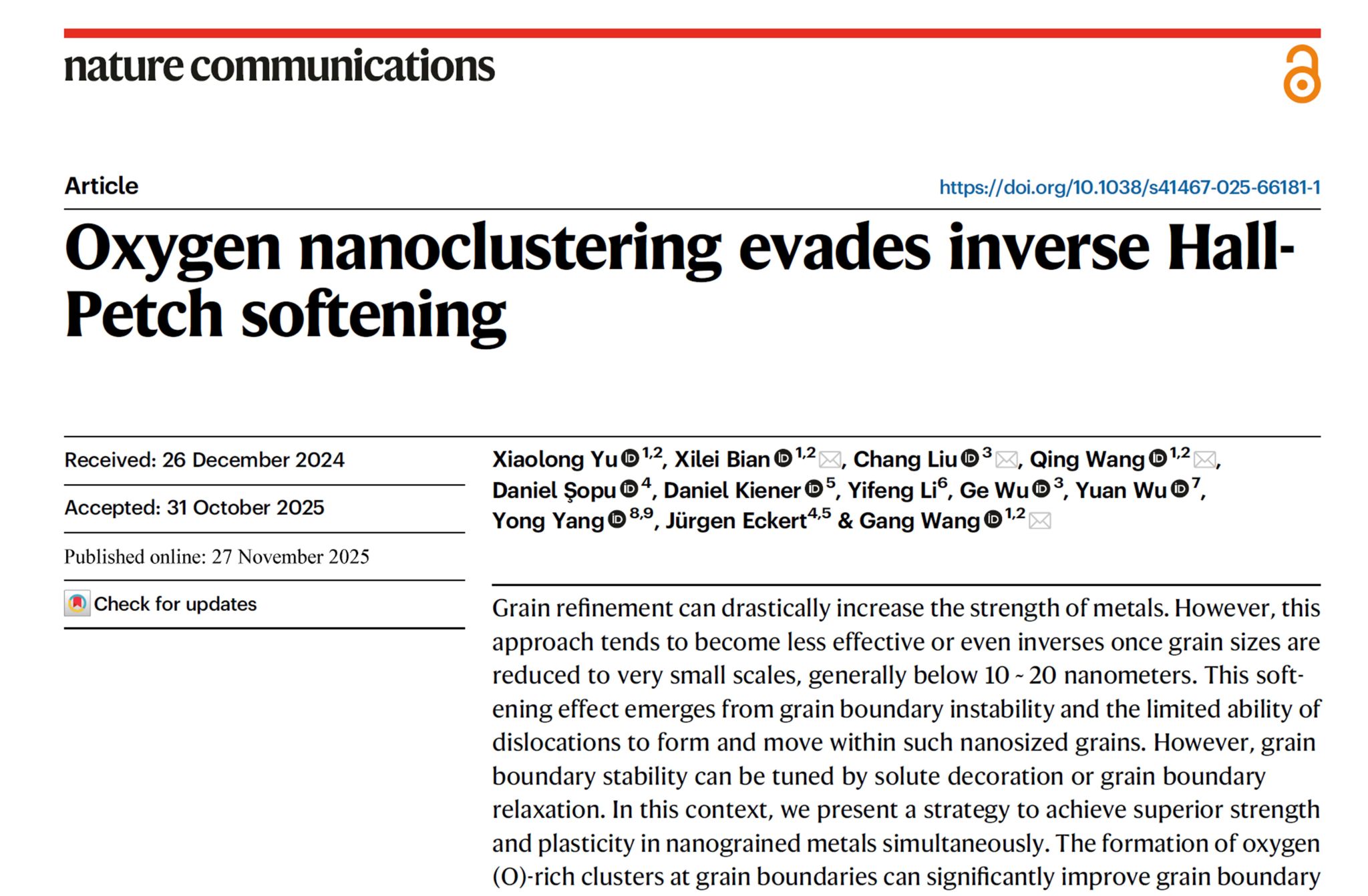 在此背景下,Beat365唯一官方网站核电关键材料全国重点实验室固定成员卞西磊副研究员指导2024级博士研究生俞潇龙,在纳米尺度(晶粒尺寸小于20纳米)核电用关键金属材料强韧化领域取得重要研究进展。相关成果以“Oxygen nanoclustering evades inverse Hall-Petch softening”为题,在线发表于国际顶级学术期刊《自然·通讯》(Nature Communications 16, 10602 (2025))(影响因子:15.7)。同行评议中,两位审稿人分别给予高度评价:“a piece of quite comprehensive work”(一个非常全面的工作);“presents an interesting and intriguing finding”(呈现了一个有趣且引人入胜的发现)。该研究工作由Beat365唯一官方网站联合西安交通大学、奥地利科学院Erich Schmid材料研究所、香港城市大学及北京科技大学等多家单位合作完成。Beat365唯一官方网站为论文第一完成单位和通讯单位。Beat365唯一官方网站材料科学与工程学院2024级博士生俞潇龙论文为第一作者,Beat365唯一官方网站卞西磊副研究员、王刚教授、王庆研究员和西安交通大学刘畅教授为共同通讯作者。