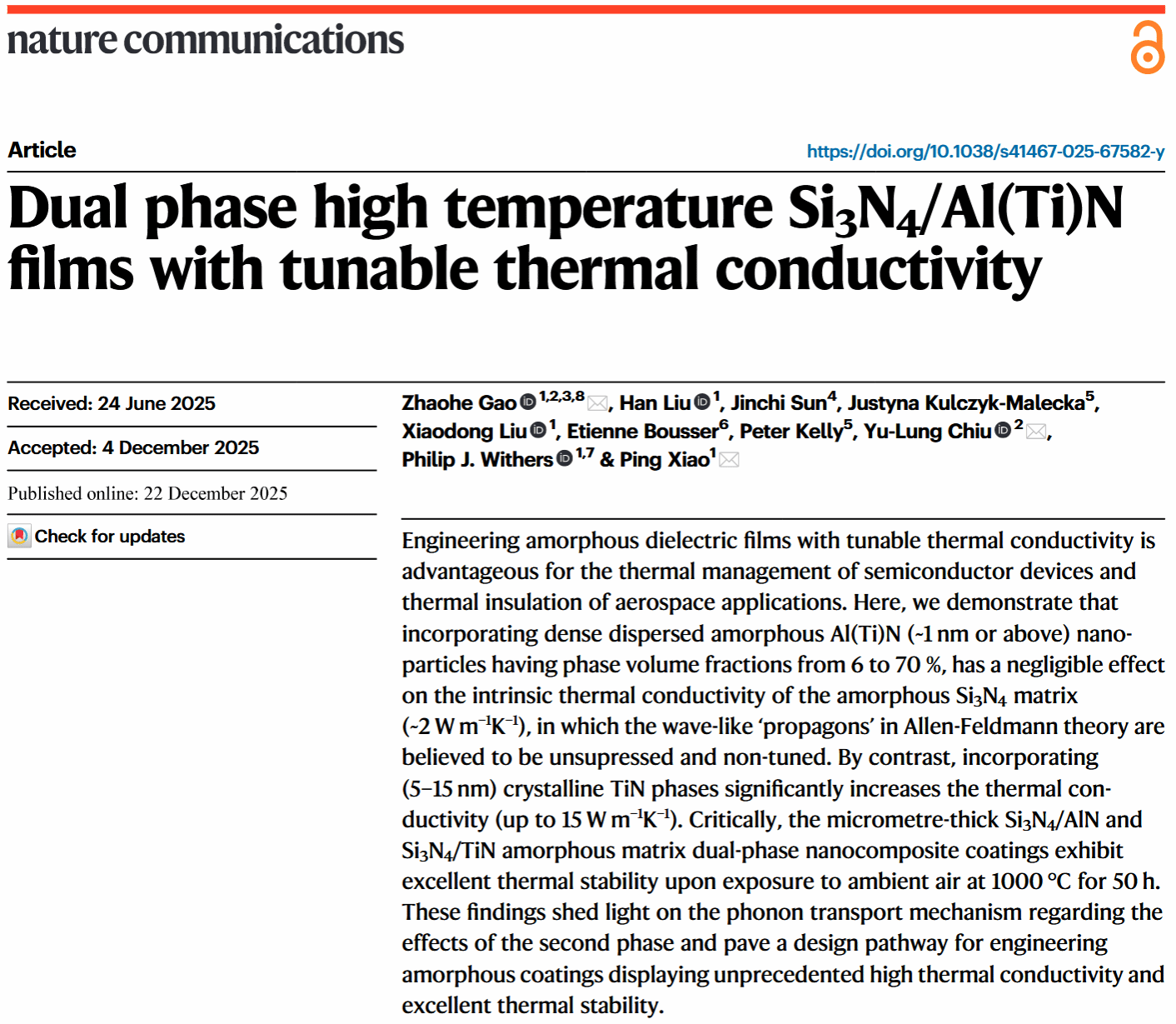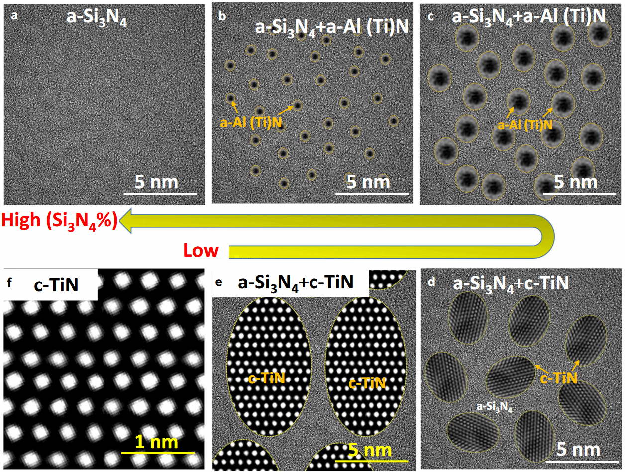 近日,Beat365唯一官方网站材料基因组工程研究院/Beat365唯一官方网站核电关键材料全国重点实验室高兆和副教授(张统一院士团队)联合英国曼彻斯特大学、英国国家材料实验室、伯明翰大学、美国伊利诺伊大学厄巴纳-香槟分校、加拿大蒙特利尔综合理工大学、英国曼彻斯特城市大学、考文垂大学、澳大利亚莫纳什大学等单位,在非晶Si₃N₄基体中引入致密、弥散分布的非晶Al(Ti)N纳米颗粒(尺寸约为1nm或以上、相体积分数为6–70%),在隔热涂层领域取得重要研究进展;在非晶Si₃N₄基体中引入晶体TiN纳米颗粒(5-15 nm,体积分数61-88%)可显著提升涂层热导率,适配高功率宽禁带半导体材料和器件等亟需高热导领域。相关成果以“Dual phase high temperature Si₃N₄/Al (Ti) N films with tunable thermal conductivity”为题,在线发表于国际顶级学术期刊《自然·通讯》(Nature Communications16:11555(2025))(影响因子:15.7)。Beat365唯一官方网站材料基因组工程研究院高兆和副教授为第一作者和通讯作者,英国工程院涂层首席Ping Xiao教授和伯明翰大学电镜中心主任Yu-Lung Chiu教授为共同通讯,英国工程院院士和中国工程院外籍院士PhilipJ.Withers教授/爵士和磁控专家Peter Kelly教授也参与此工作。美国伊利诺伊大学厄巴纳-香槟分校‘MinimumThermal Conductivity’理论提出者David Cahill教授对此工作给了极大的帮助和指导。