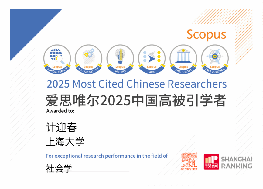 近日,爱思唯尔(Elsevier)正式发布2025“中国高被引学者” (Highly Cited Chinese Researchers)榜单。2025年“中国高被引学者”上榜共计6310人, 来自543所高校、企业及科研机构,覆盖了教育部10个学科领域、83个一级学科。社会学学科,共有18位在中国机构任职的学者上榜。我院计迎春教授入选,这也是计迎春教授第三次进入此榜单。