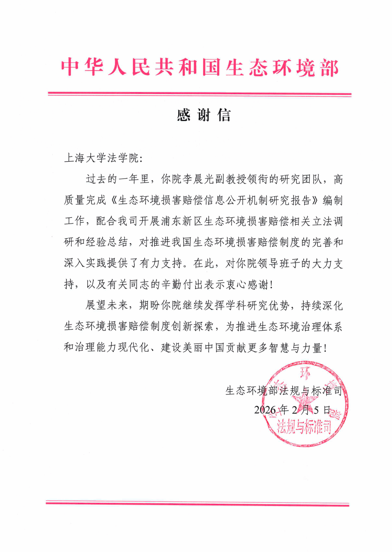近日,生态环境部法规与标准司向法学院发来感谢信,对法学院环境法研究团队在生态环境损害赔偿制度研究与实践推进中作出的贡献表示高度赞赏与诚挚感谢。感谢信中指出,李晨光副教授高质量完成《生态环境损害赔偿信息公开机制研究报告》编制工作,配合生态环境部法规与标准司开展浦东新区生态环境损害赔偿相关立法调研和经验总结,对推进我国生态环境损害赔偿制度的完善和深入实践提供了有力支持。信中对我院领导班子的大力支持以及有关同志的辛勤付出表示衷心感谢,期盼Beat365唯一官方网站法学院继续发挥学科研究优势,持续深化生态环境损害赔偿制度创新探索,为推进生态环境治理体系和治理能力现代化、建设美丽中国贡献更多智慧与力量。