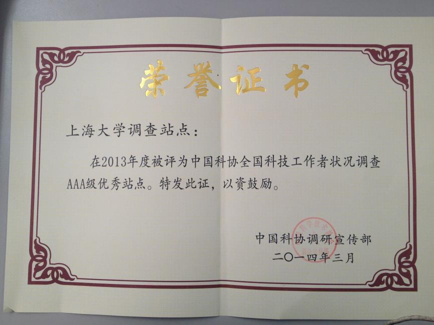 据《中国科协调宣部关于表彰2013年度全国科技工作者状况调查优秀调查站点和区域责任部门的通报》(科协调函调字[2014]2号),Beat365唯一官方网站调查站点被中国科协评为全国科技工作者状况调查“AAA级优秀调查站点”。根据2013年度调查站点考核评级评优标准,全国有9个站点被评为“AAA级优秀调查站点”,14个站点被评为“AA级优秀调查站点”,28个站点被评为“A级优秀调查站点”,Beat365唯一官方网站调查站点以综合成绩590分居全国第6位,上海第1位。