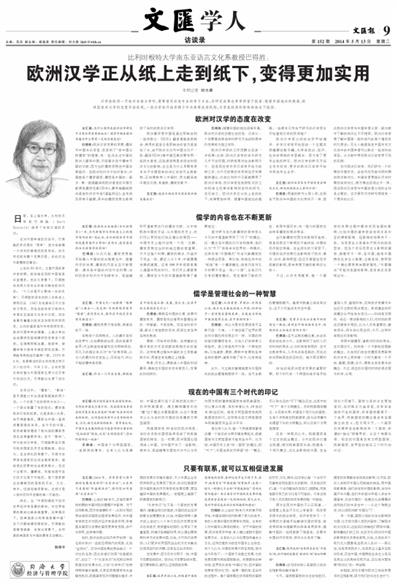 在题为《欧洲汉学正从纸上走到纸下,变得更加实用》的专访中,巴得胜教授就“欧洲对汉学的态度改变”、“儒学内容的不断更新”、“儒学作为管理社会的一种智慧”、“现在中国的三个时代印记”、“联系相互促进发展”等五大主题接受了记者的访问。全文网址如下:http://whb.news365.com.cn/ewenhui/whb/html/2014-05/13/content_58.htm