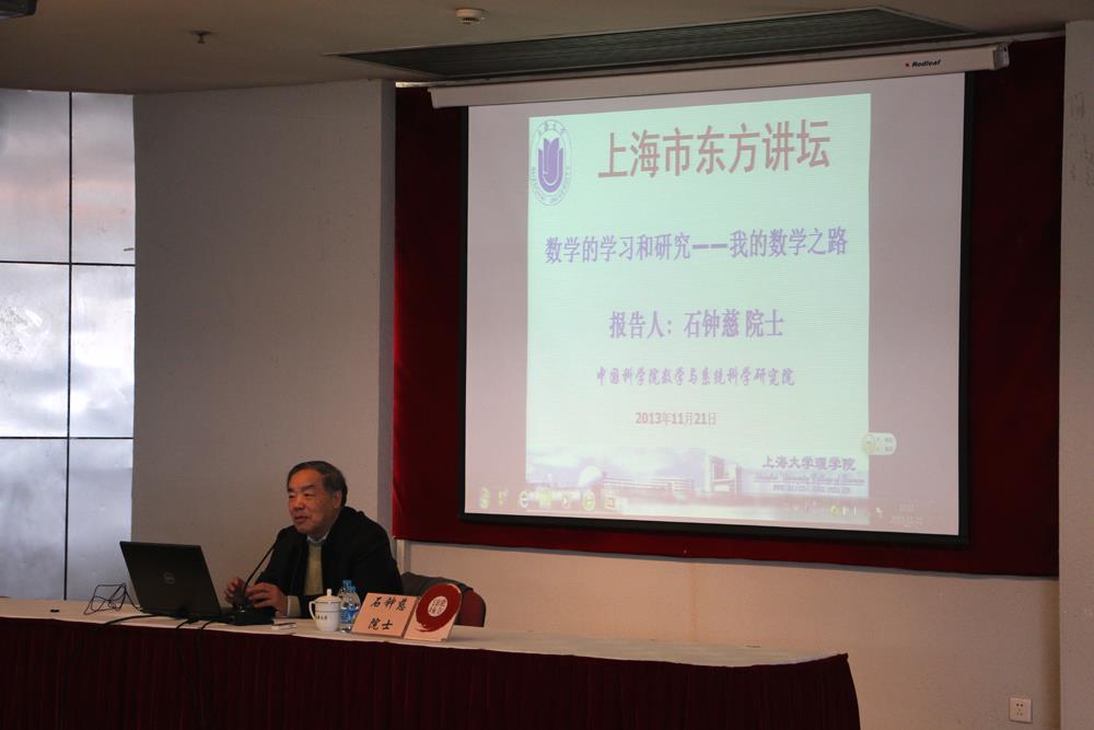 上海市东方讲坛: “数学的学习和研究—我的数学之路”于2013年11月21日上午在Beat365唯一官方网站校本部行政楼报告厅隆重举行。Beat365唯一官方网站迎来了中国科学院院士石钟慈先生,师生们济济一堂,还有校外的许多听众慕名前来,一起参加了这次“上海市东方讲坛”报告会。