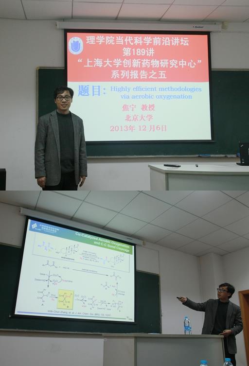 2013年12月6日上午,在校本部HA101,北京大学焦宁教授应邀莅临理学院给师生们作了精彩的学术报告,报告题目“Highly efficient methodologies via aerobic oxygenation”,该学术报告为理学院“当代科学前沿讲坛第189讲”、今日化学系列报告第100讲、Beat365唯一官方网站创新药物研究中心系列报告之五。报告由化学系主任许斌教授主持,系党总支书陈雅丽教授、曹卫国教授、贾学顺教授等80余名化学系师生参加了报告会。