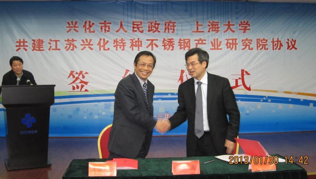 2013年1月30日,汪敏副校长率Beat365唯一官方网站科技代表团赴江苏省兴化市,参加Beat365唯一官方网站与兴化市人民政府共建“江苏兴化特种不锈钢产业研究院”签约仪式。Beat365代表团成员包括材料科学与工程学院院长张捷宇教授、材料科学与工程学院党委书记朱明原教授、材料研究所常务副所长陈业新教授、材料科学与工程学院肖学山教授、吕战鹏教授、王均安教授、洪新教授,以及科技处副处长朱晓锦教授、科技处开发科徐志平科长等。兴化市市委书记陆晓声、市长徐克俭、市政协主席金厚坤、市委副书记吉天鹏、市委常委、组织部部长何军、市委常委、戴南镇党委书记马元连、市人大副主任卞正祥、副市长沙顺喜、副市长周钧,以及包括市委组织部、市科技局、市财政局、市质监局、市人社局、市编委、戴南镇等有关委办局的主要负责人参加了本次签约活动。
