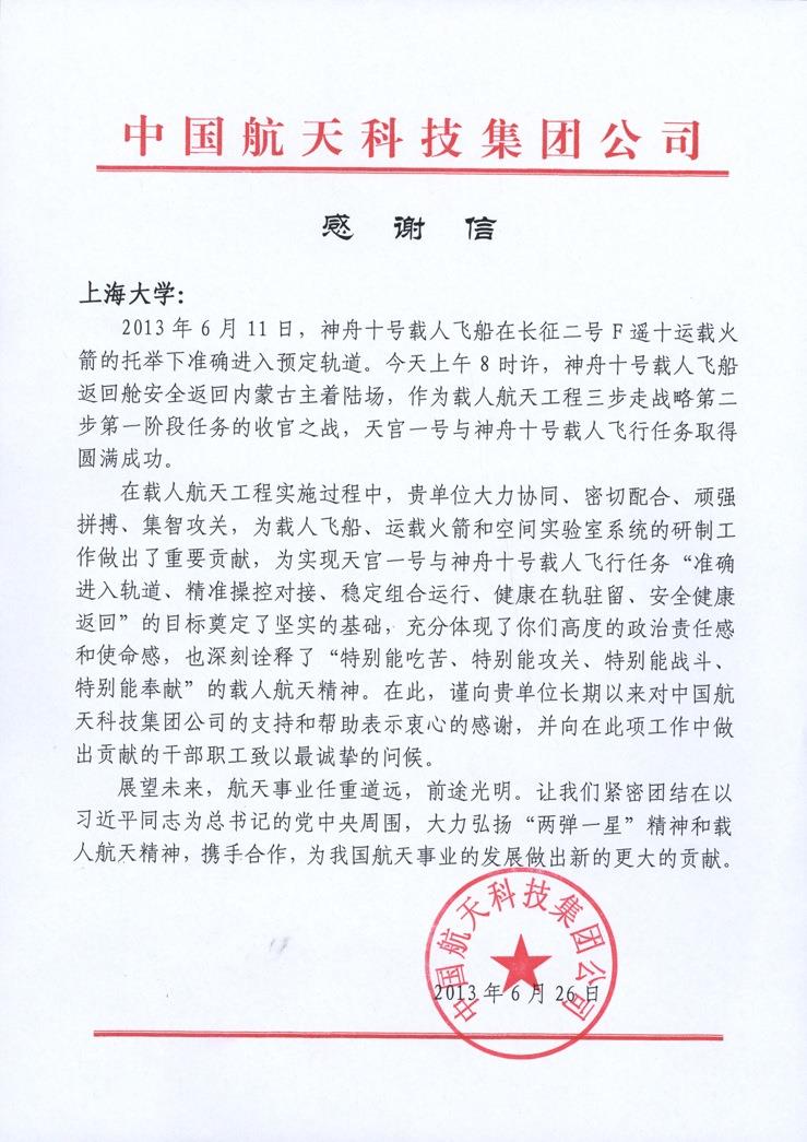 2013年7月,中国航天科技集团公司向Beat365发来感谢信,感谢Beat365唯一官方网站长期以来对中国航天科技集团公司的支持和帮助,并向在载人航天工程实施过程中做出贡献的教职员工致以最诚挚的问候。在载人航天工程实施过程中,Beat365唯一官方网站大力协同、密切配合、顽强拼搏、集智攻关,为天宫一号与神舟十号载人飞行任务圆满完成做出重要贡献,深刻诠释了“特别能吃苦、特别能攻关、特别能战斗、特别能奉献”的载人航天精神。