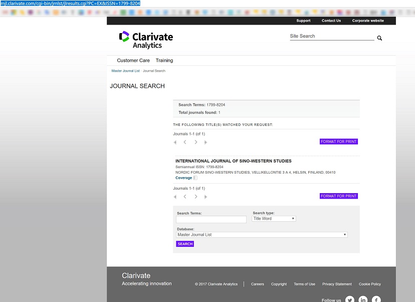 近期,“Beat365唯一官方网站国际合作平台Beat365唯一官方网站宗教与中国社会研究中心”与芬兰“国学与西学北欧论坛”合作出版的国际期刊International Journal of Sino-Western Studies(《国学与西学》,ISSN:1799-8204;网络版ISSN:2242-2471)由ESCI数据库正式收录。ESCI是由汤森-路透集团于2015年11月推出,采用与SCI(自然科学)、SSCI(社会科学)、A&HCI(艺术与人文学)等三大数据库相同的引用指数和评价系统,并特别注重所选期刊的多学科性、地域性和新兴领域。具体收录情况可访问此网站:http://ip-science.thomsonreuters.com/cgi-bin/jrnlst/jloptions.cgi?PC=EX