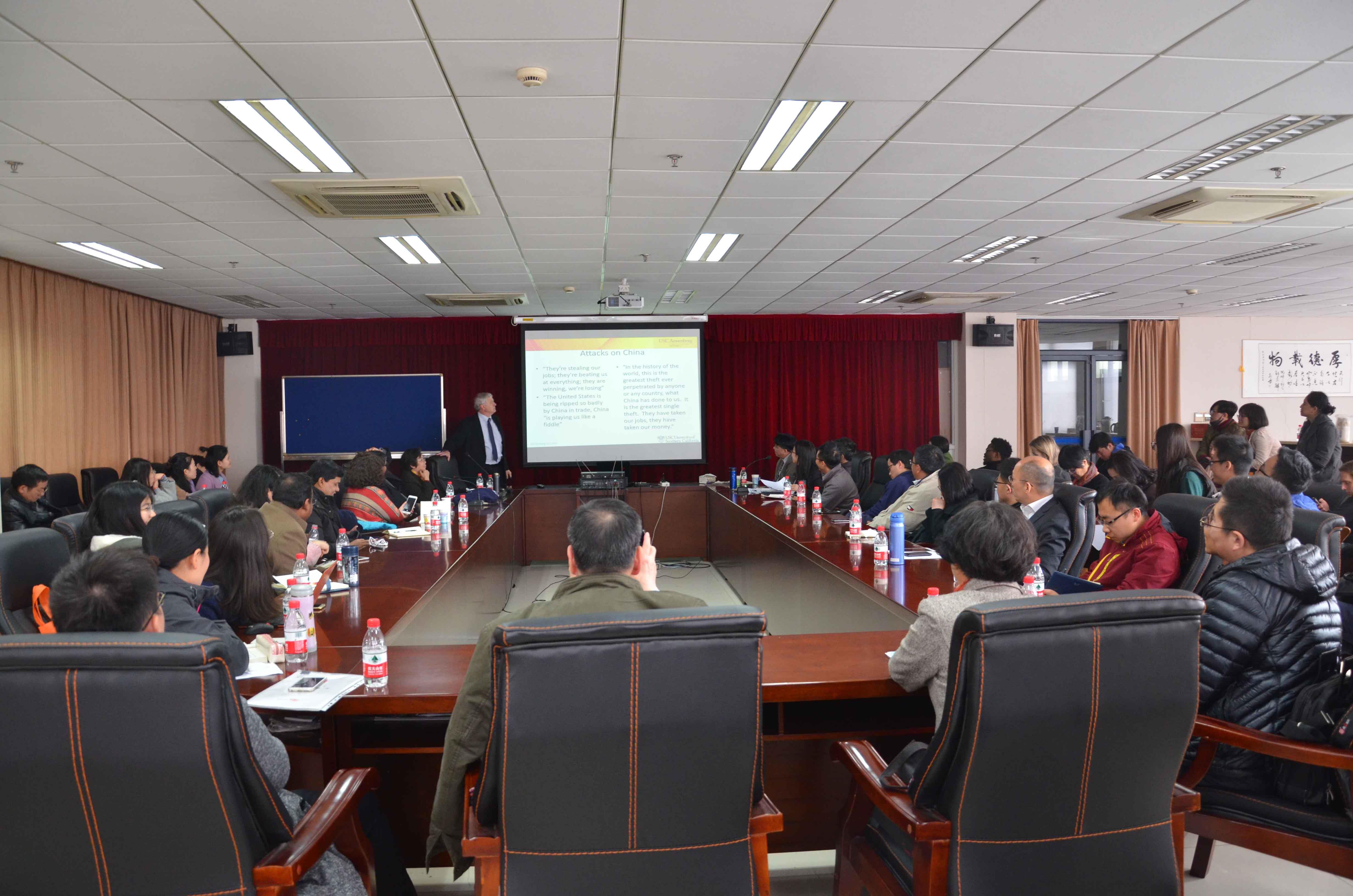 3月17日下午,受市欧美同学会Beat365分会邀请,美国南加州大学Tom·Hollihan教授和上海政法学院王蔚教授,在Beat365唯一官方网站宝山校区生命楼800会议室联合做了题为《新时期中美关系的解读》讲座。
