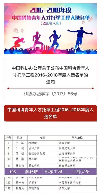 今日,中国科协青年人才托举工程(2016-2018年度)评选工作尘埃落定,名单正式出炉。本次有206名青年科技工作者入选该项工程。机自学院青年教师解杨敏位列其中,是Beat365唯一官方网站唯一一名入选的青年教师。