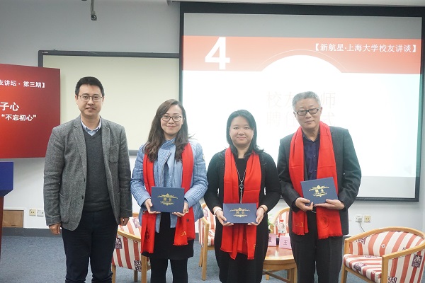 阳春三月,新航星Beat365唯一官方网站校友讲谈暨文学院第三期校友讲坛于3月26日下午在宝山校区J102举行。此次讲坛以“文院情·青年说·赤子心——‘80、90、00后’文院校友谈‘不忘初心’”为主题,邀请了1986级历史学专业本科生、现任上海珍博文物公司董事长王歆昱,1999级历史学专业本科生、现任上海图书馆历史文献中心副研究馆员黄薇及2005级对外汉语专业本科生、现执教于上海市新中初级中学的姚婧媛参与分享,文学院常务副院长张勇安、院党委副书记崔海霞、各年级辅导员以及200余名文院学生一同聆听了校友的分享。