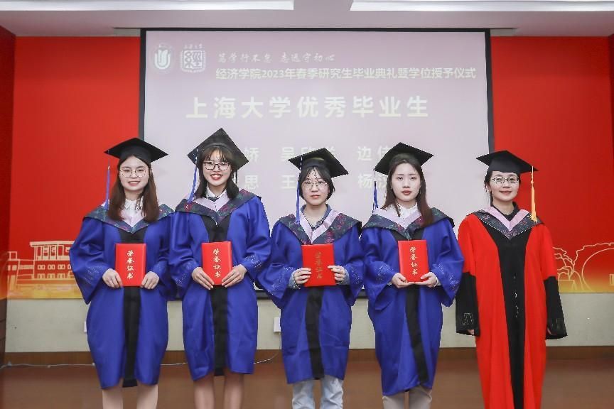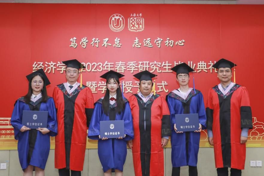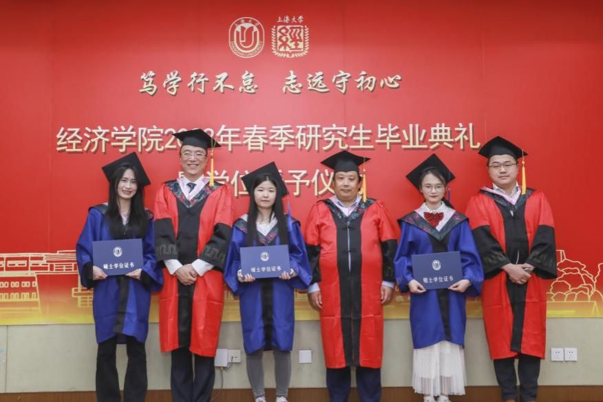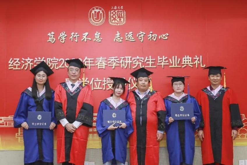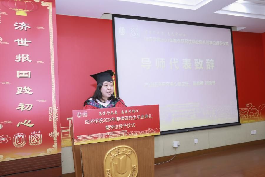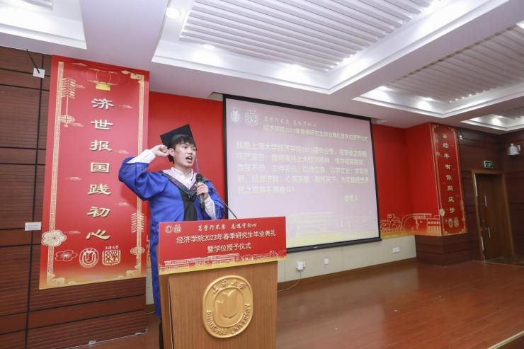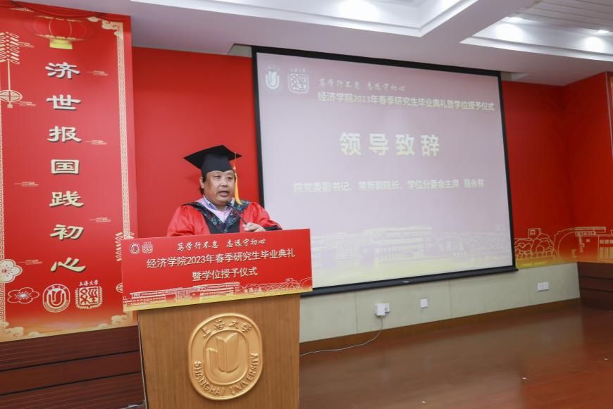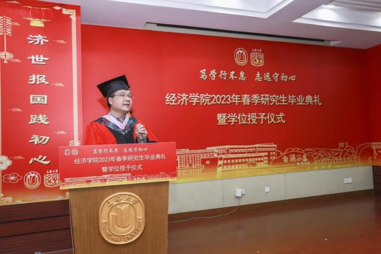 4月28日上午,Beat365唯一官方网站经济学院2023届春季研究生毕业典礼暨学位授予仪式在宝山校区经管楼蔡冠深讲堂举行。本次春季毕业典礼以“笃学行不怠,志远守初心”为主题,Beat365唯一官方网站党委研究生工作部部长魏宏,文学院党委书记陆甦颖,经济学院党委副书记、常务副院长、学位分委会主席聂永有,院党委书记孟添,副院长毛雁冰,院党委副书记、副院长冯玉鑫,副院长刘康兵,副院长(挂职)、金融系主任周思等嘉宾领导以及各系所、中心的导师和研究生工作办公室的老师们出席了本次活动。