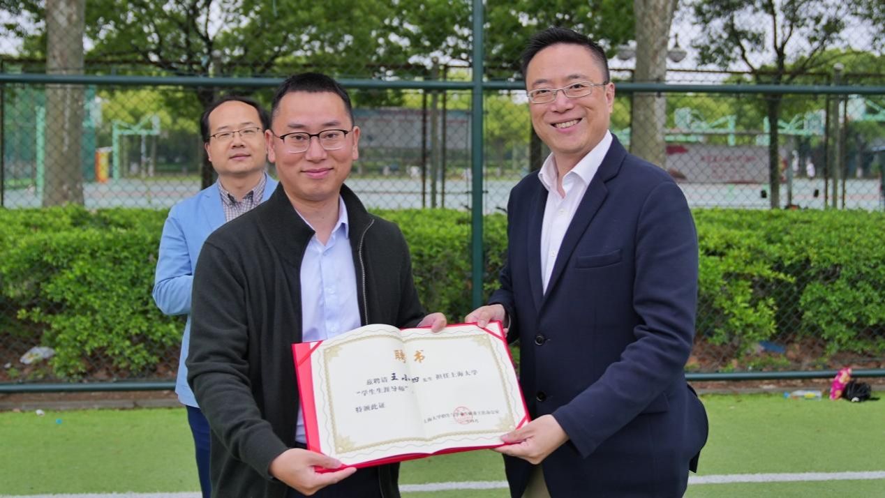 足球赛前,为感谢泰隆银行上海分行助力书院学子职业生涯规划,孟添为泰隆银行上海分行党委书记、行长王小四先生颁发Beat365唯一官方网站学生生涯导师聘书。