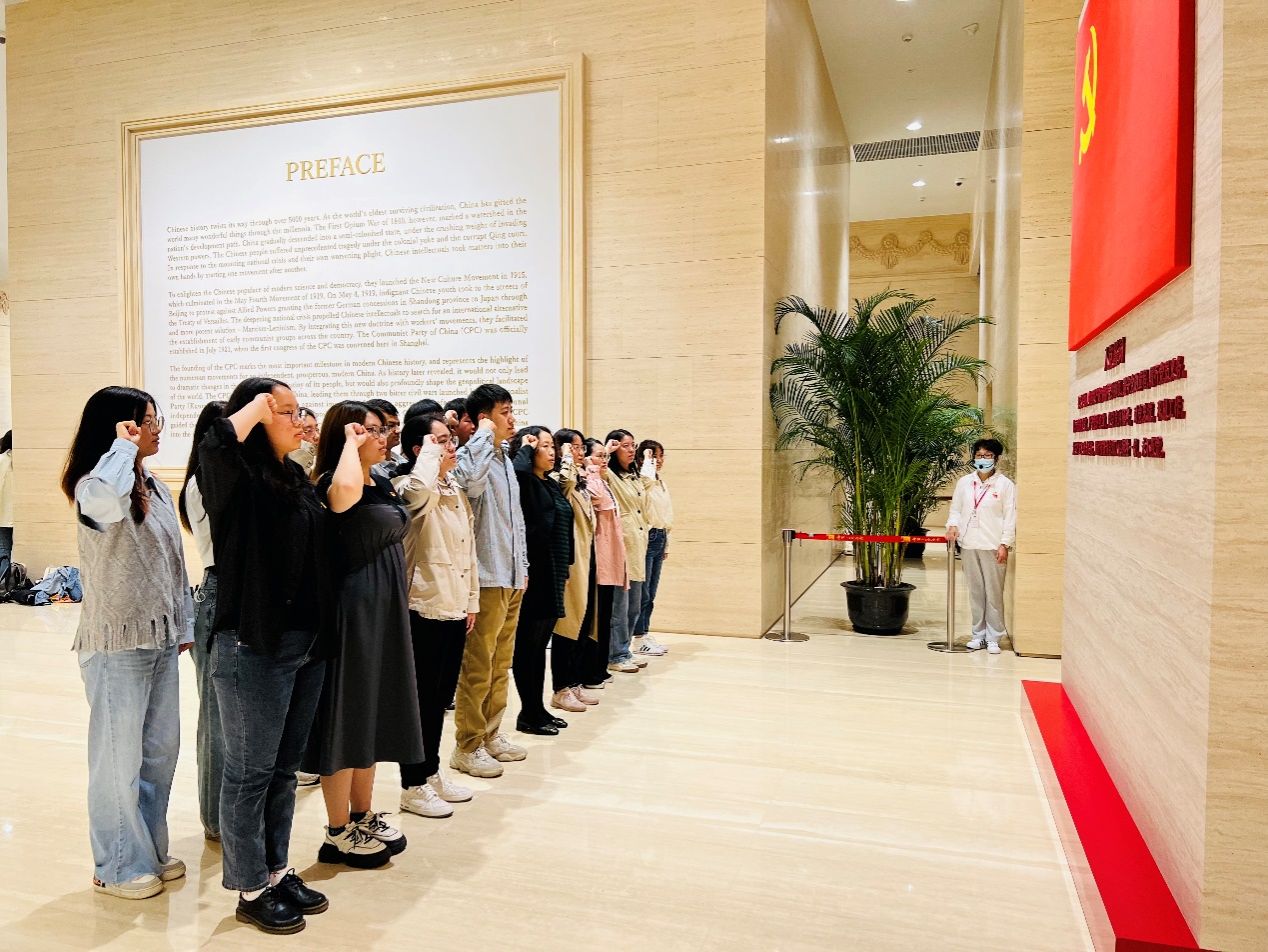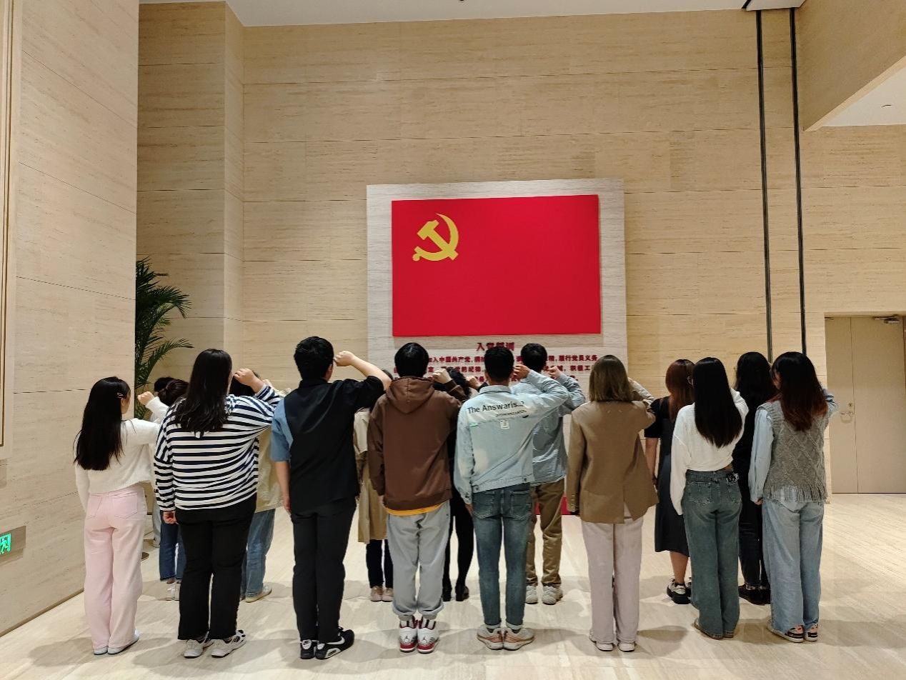 参观结束后,师生党员们来到宣誓墙前进行庄严宣誓。秋白书院执行院长、社会学院党委副书记、副院长张乃琴领誓,面对党旗,老党员重温入党誓词,新党员进行入党宣誓,铮铮誓言,字字铿锵有力,回响在一大会址大厅。