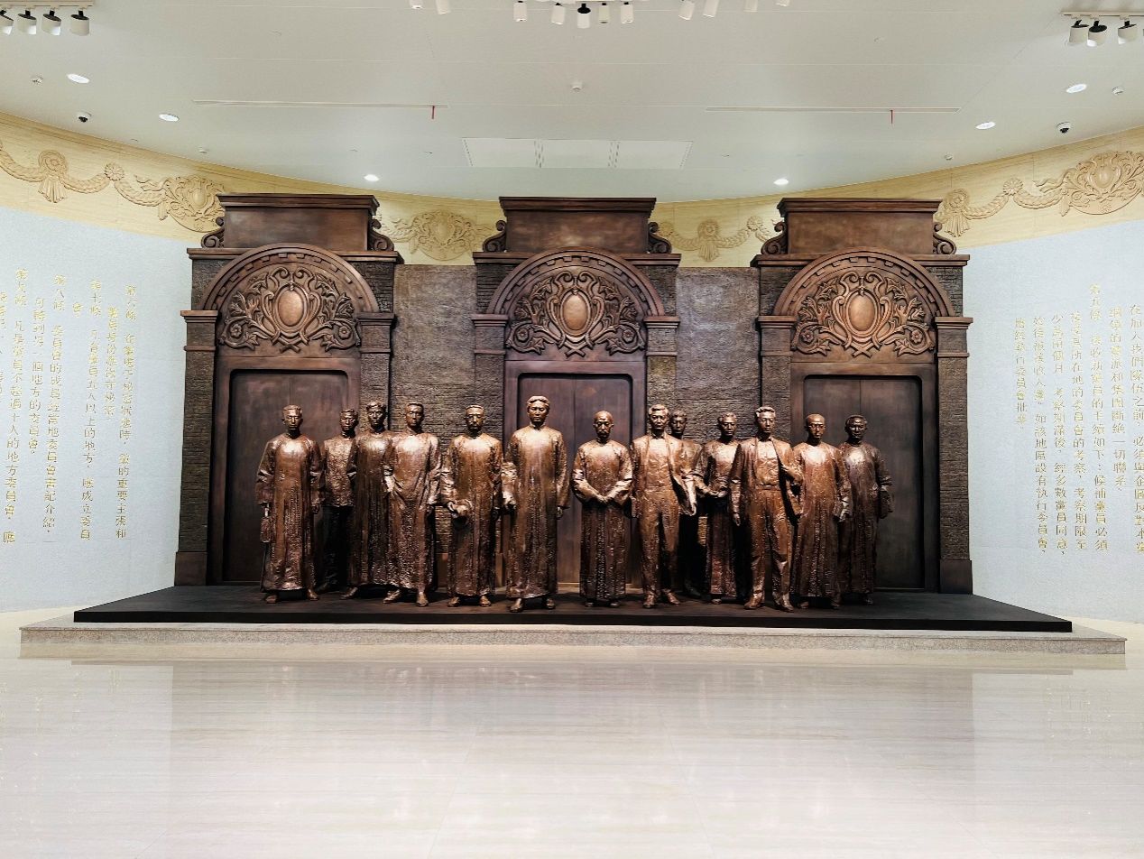 进入序厅中央,映入眼帘的是名为《历史选择伟大起点》的雕塑作品,其展现了十三位中共一大代表步伐坚定地迈出石库门的历史瞬间,青铜雕塑的沉稳折射出先辈们英勇无畏的革命精神与信念,让大家都驻足观看,为之动容。