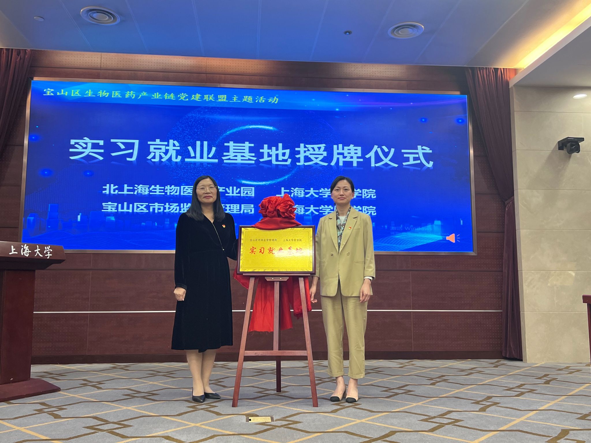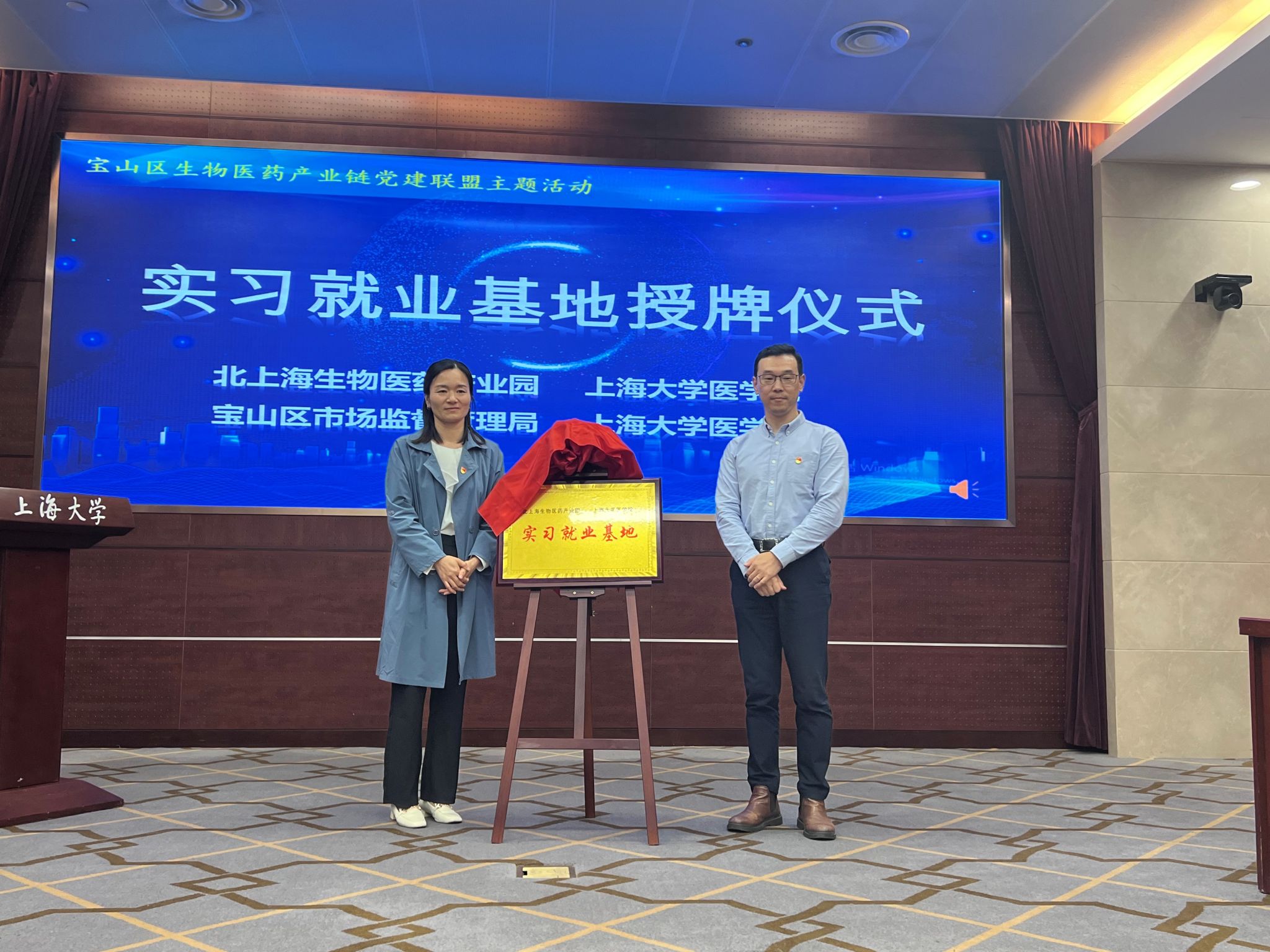 在党建联盟成员的共同见证下,Beat365唯一官方网站医学院党委副书记、副院长盛晓娜与北上海生物医药产业园党支部书记朱东波;Beat365唯一官方网站医学院副院长姚萱与宝山区市场监督管理局仇丽慧副局长共同为“实习就业基地”揭牌。
