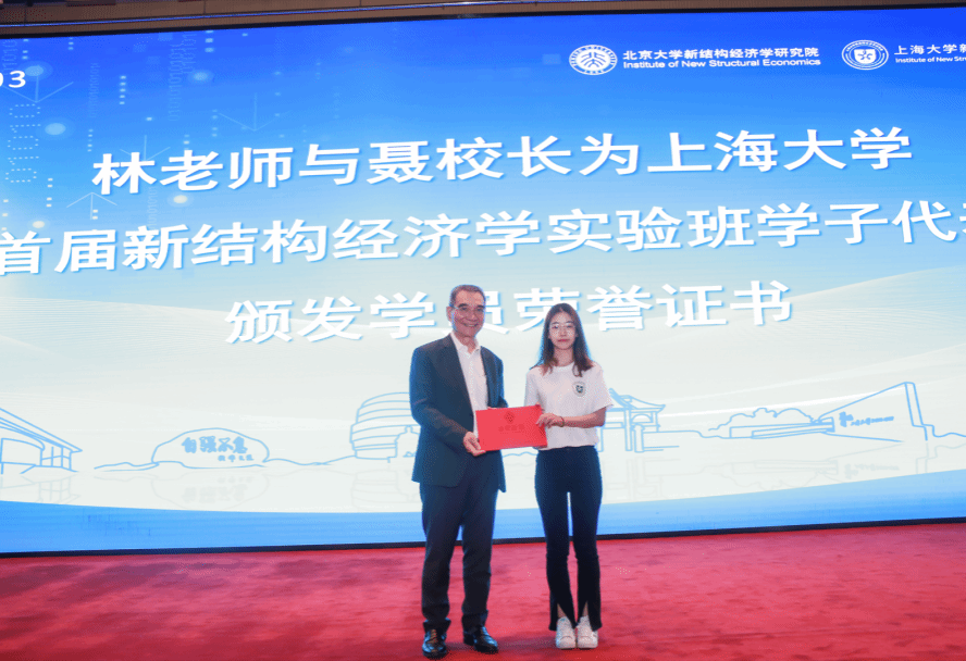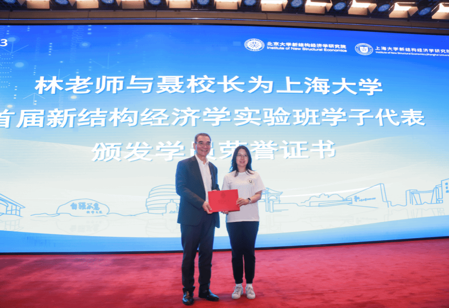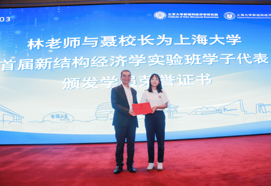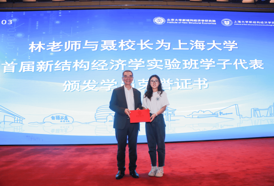 随后,林老师与聂校长为Beat365唯一官方网站首届新结构经济学实验班学子代表颁发了学员荣誉证书,肯定了他们在学习和研究中所付出的努力与成果。Beat365唯一官方网站首届新结构经济学实验班张益娇、陈彦琳、奚卫滢、孙语等四位同学作为学员代表,接受了林老师与聂校长颁发的学员荣誉证书。