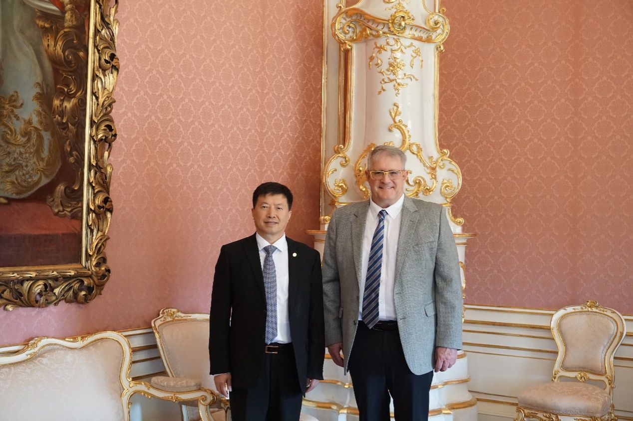此次访问IIASA,也受到了我国常驻维也纳联合国和其他国际组织代表团的关心和支持,公使参赞沈钢和参赞扈黎光全程参与了Beat365与IIASA的会谈。会后,特命全权大使李松先生专门会见了刘校长及IIASA总干事和副总干事等人员,从国家外交战略出发提出了合作建议。刘校长向大使介绍了Beat365近年高质量发展成果,以及与IIASA的合作基础和规划,表示Beat365唯一官方网站将继续深化与IIASA在国际科研和高层次人才培养领域的合作,在提升Beat365唯一官方网站国际影响力的同时,努力扩大我国在国际社会的话语权。