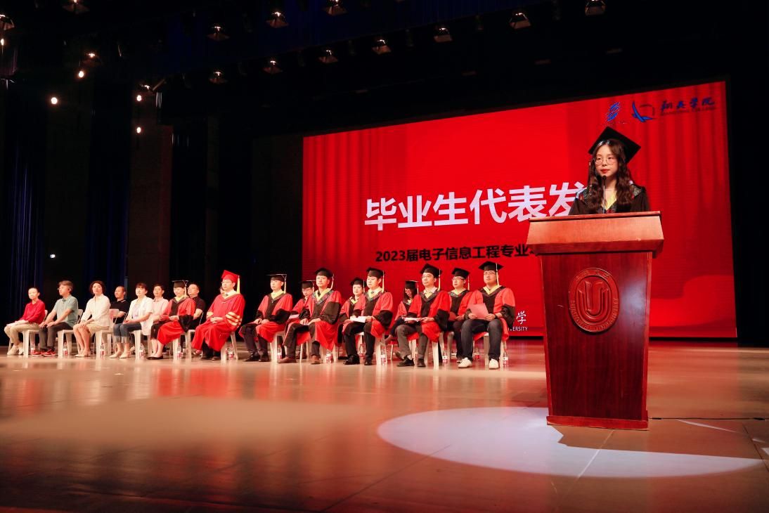 2023届本科毕业生、上海市优秀毕业生刘璇作为本科生代表发言。她代表所有毕业学生向一路以来悉心培养的老师们表示诚挚的敬意和衷心的感谢,提到希望大家要做胸怀大智并脚踏实地,做富有责任并勇挑重担的通信人。