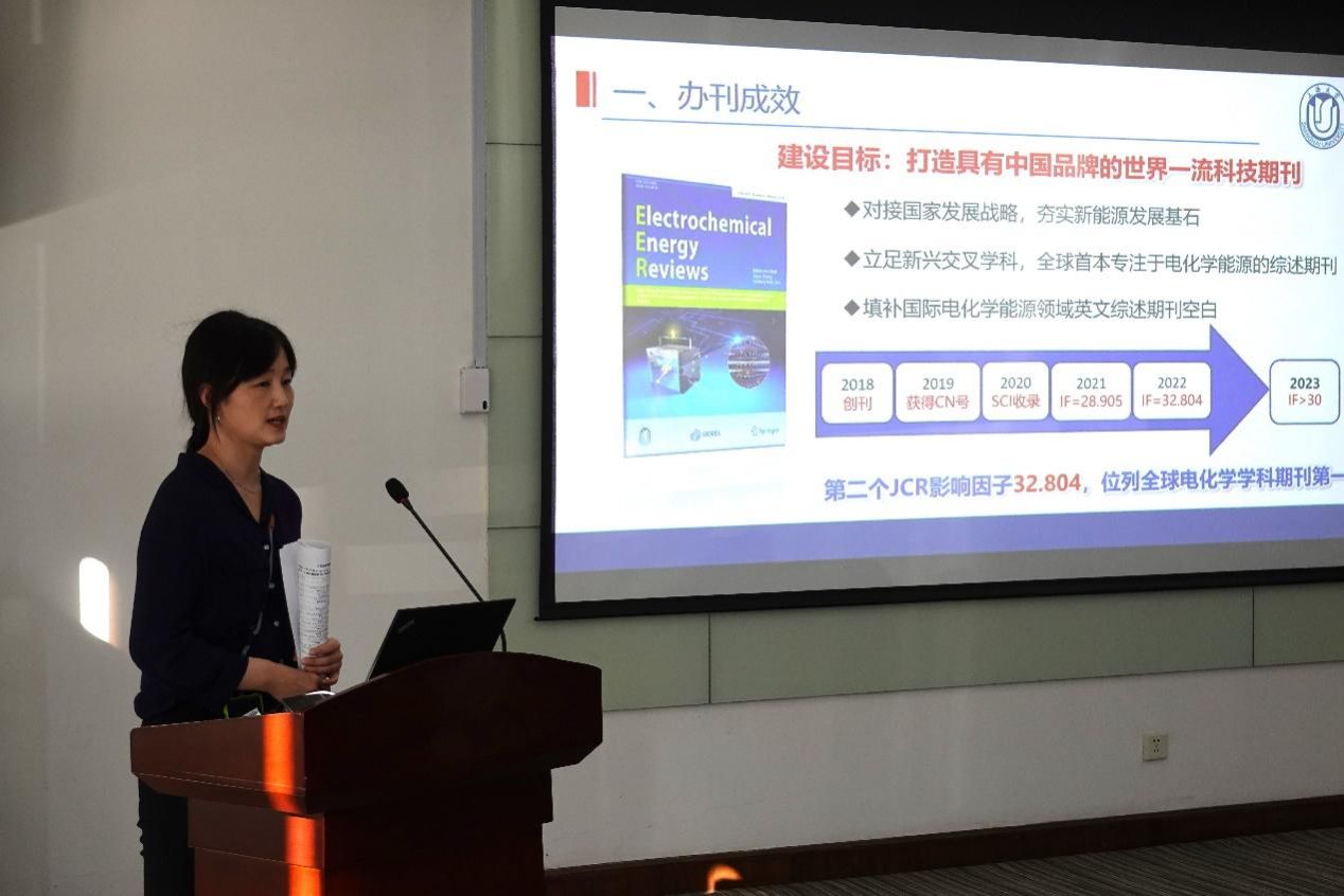 《应用数学和力学(英文版)》徐海丽主任就“依托卓越计划,AMM创新发展探索”进行了精彩汇报;《电化学能源评论(英文)》何晓燕主任以“初心如磐,奋楫笃行:EER国际影响力提升的探索与实践”为题就EER的办刊成效与办刊举措进行了交流。此外,《中国激光》杂志社杨蕾和邓迎、《细胞研究》程磊、《纳微快报》张丽英、《运动与健康科学》鲍芳、《超导(英文)》王亚伟和《分子植物》崔晓峰等7位杂志社或期刊负责人围绕刊群建设、卓越期刊稿件质量把控、科学编辑人才培养、期刊助力高校“双一流建设”、新刊创办和运营、期刊出版平台建设等进行了全方位、多角度的交流和探讨。其中,座谈会精彩的报告和深入交流引起了与会人员的热烈反响和讨论。