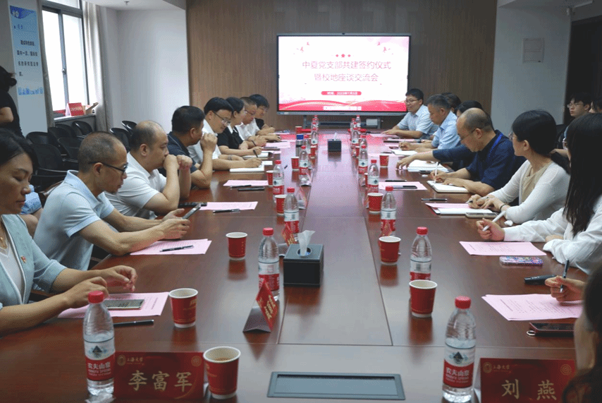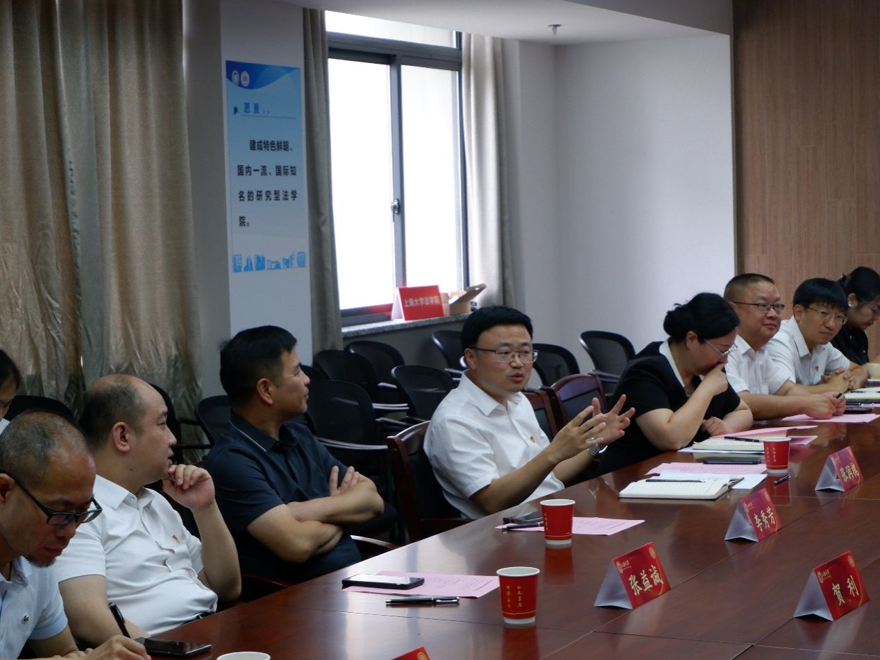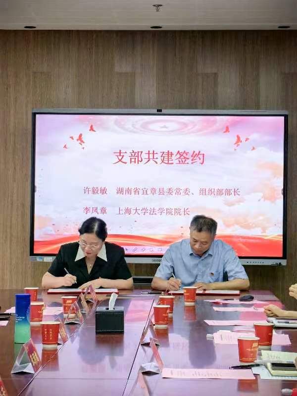 为了认真贯彻落实党的二十大精神,进一步继承邓中夏先烈的革命遗志,弘扬中夏精神,积极探索创新区域化党建新模式,2023年7月3日上午,法学院党委和湖南宜章县委共建中夏党支部签约仪式暨校地座谈交流会在Beat365唯一官方网站宝山校区法学院304会议室顺利举行,校党委常委、组织人事部常务副部长、组织处处长沈艺,中共湖南宜章县委员会书记张润槐出席,法学院党委副书记、院长李凤章和宜章县委常委、县委组织部部长许毅敏代表双方签订共建协议。