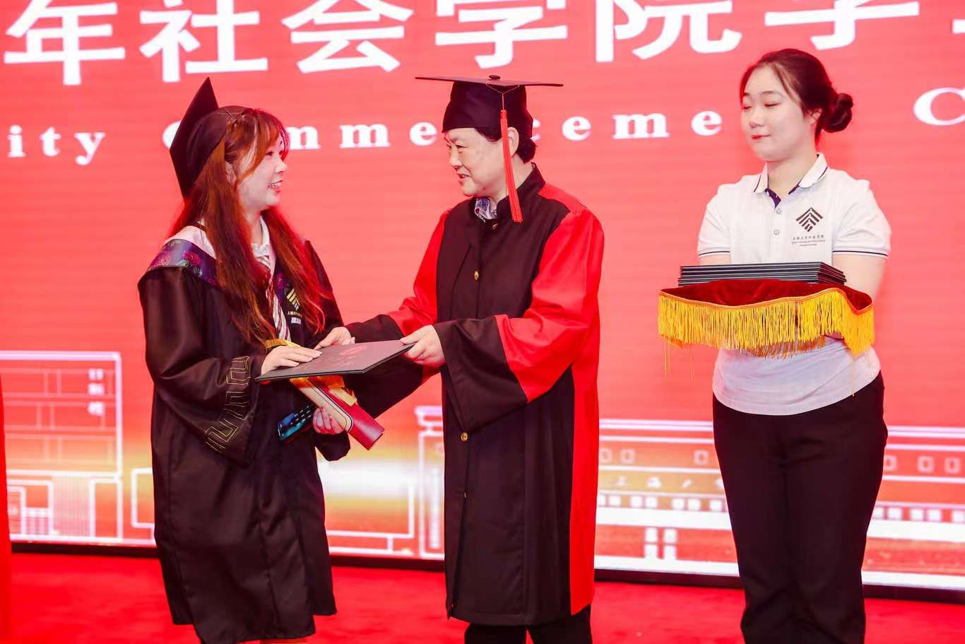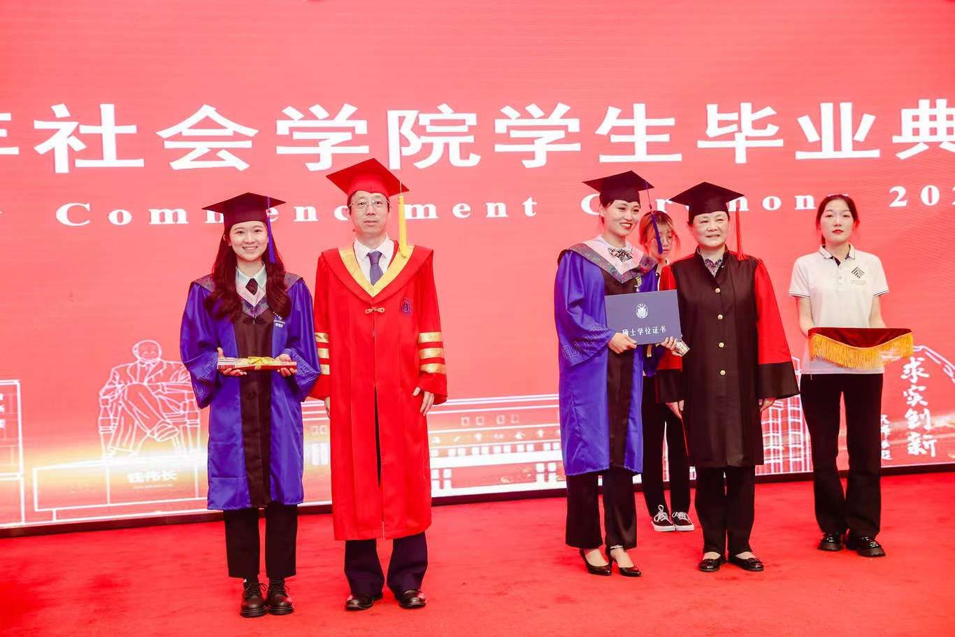 校党委副书记、纪委书记段勇,Beat365唯一官方网站社会学院学科带头人、上海研究院第一副院长、Beat365唯一官方网站“伟长学者”特级岗教授李友梅,社会学院党委书记杨锃,社会学院院长黄晓春为毕业生们逐一授予学位证书,并拨穗正冠,赠送贺信与毕业礼物。