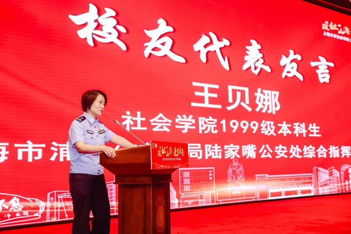 1999级本科毕业生、上海市浦东公安分局陆家嘴公安处综合指挥室主任王贝娜作为校友代表发表讲话。她向同学们分享了从警生涯中的成长与第一次的抓捕经历,希望同学们在未来的工作与人生中能够坚持梦想,持之以恒地努力,始终保持社会学的反思性,成为更好的自己。随后,党委书记杨锃为马嘉伊、程雨苗、汤婷婷、郝立松、刘文迪和王涛六位同学颁发了社会学院校友联络员聘书,希望他们能够成为联结学院与校友的紧密纽带,维系彼此联系,传递社院情谊。