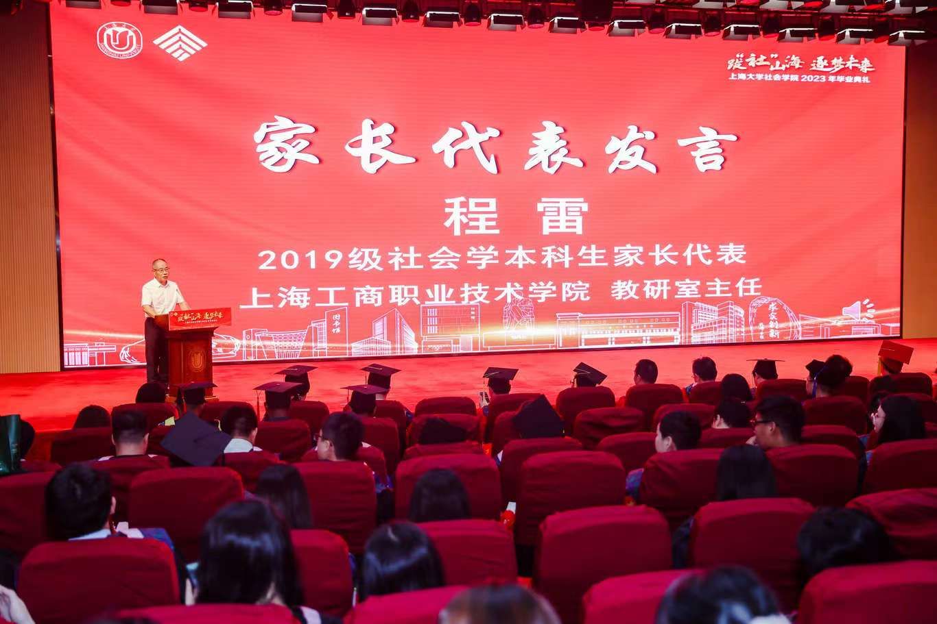 2019级社会学本科生家长代表、上海工商职业技术学院教研室主任程雷先生作为家长代表上台发言。身在一个拥有三代“Beat365”基因的家庭,他对Beat365唯一官方网站怀着一份深厚的情谊。程雷先生对校院领导、老师和辅导员们耐心细致的陪伴表达了深深的感激。同时,他也祝福毕业生能够成为善良、幸福的人,在未来的日子里谨记校训院训,自强不息、扎根田野、展望未来。