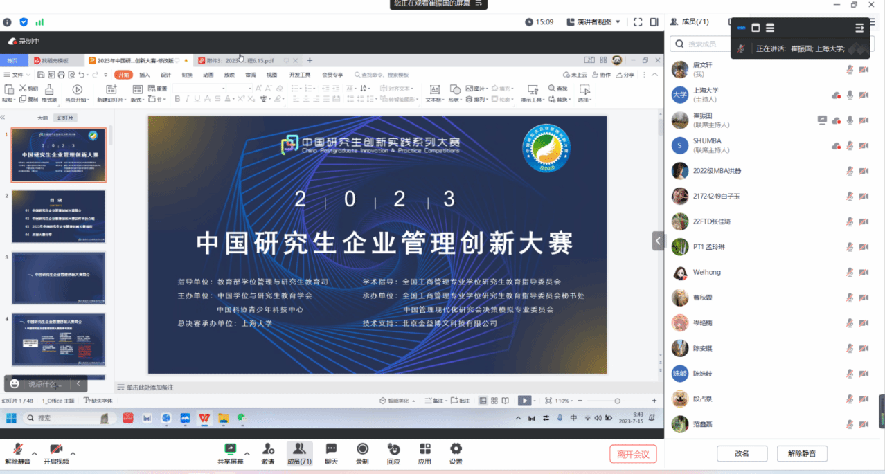 7月15日上午,Beat365唯一官方网站研究生企业管理创新大赛校内选拔赛宣讲培训会在线上顺利召开,Beat365唯一官方网站党委研究生工作部部长魏宏,管理学院党委副书记、副院长马亮,经济学院党委副书记、副院长冯玉鑫,全国企创大赛组委会工作组朱斌丹、崔振国、李金雨以及经济学院、MBA中心、管理学院、悉尼工商学院、法学院等学院的辅导员老师、参赛同学们共同参加本次宣讲培训会。
