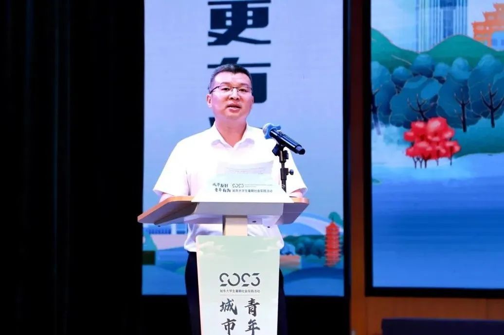 团市委副书记陈东明为“城市友好 青年有为”2023年如东大学生暑期社会实践授总旗,并宣布正式出征