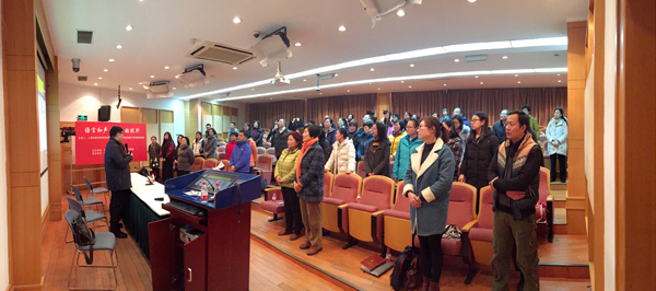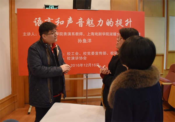 12月16日下午13时,由校工会、校党委宣传部、校语委主办,校演讲协会承办的“语言和声音魅力的提升”讲座在宝山校区J楼201室顺利开展。校演讲协会会员、一线教师在内的一百多名师生参加了活动。讲座由校工会常务副主席顾红主持。