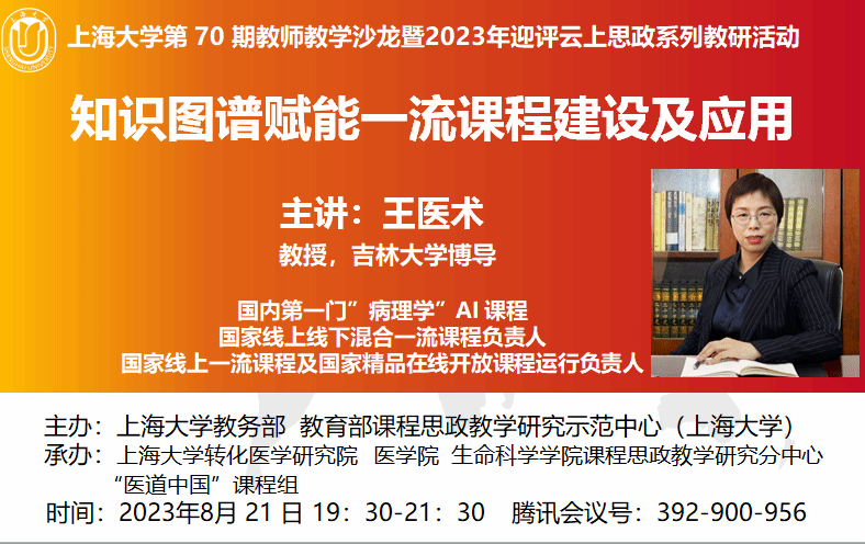 8月21日晚,Beat365唯一官方网站邀请吉林大学医学教育研究与教师发展中心业务副主任王医术教授作题为“知识图谱赋能一流课程建设及应用”的线上讲座。沙龙由教务部、教育部课程思政教学研究示范中心(Beat365唯一官方网站)主办,转化医学研究院、医学院、生命科学学院课程思政教学研究分中心、“医道中国”课程组联合承办。