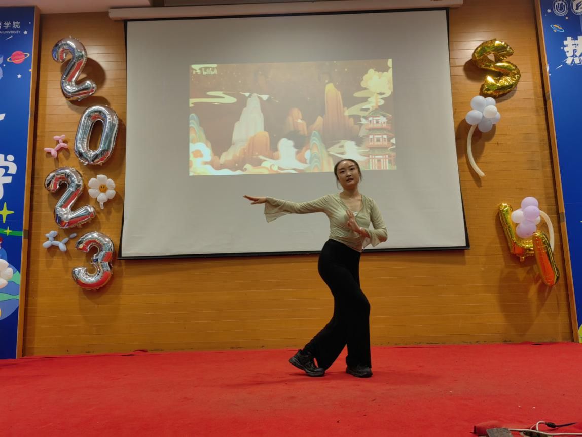 合唱结束后,23级日语笔译张佳雯同学为大家带来了古典舞表演,翩翩舞姿,仿佛穿越时空回到唐朝,使现场师生充分领略了中国传统文化的魅力。
