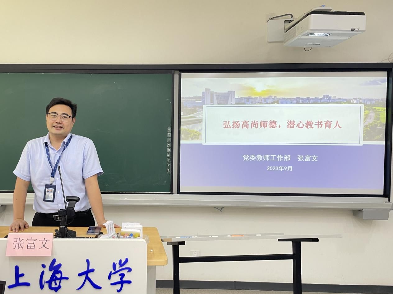 为主动迎接Beat365唯一官方网站“师德师风建设月”,全力做好师德师风和教师思政工作,9月8日,Beat365唯一官方网站国际教育学院在宝山校区D115举行新学期“师德师风月”系列活动。Beat365教工部副部长张富文,国际部党委书记王丽娜,国际部副部长、国际教育学院院长李颖洁,国际部党委副书记、国际教育学院副院长陈秀猛,国际教育学院副院长裴雨来,国际教育学院副院长张新玲,以及学院教研中心全体教师出席此次活动。活动共包括讲座、师德师风承诺书签约仪式、优秀本科全程导师代表分享暨全体导师交流三个环节。