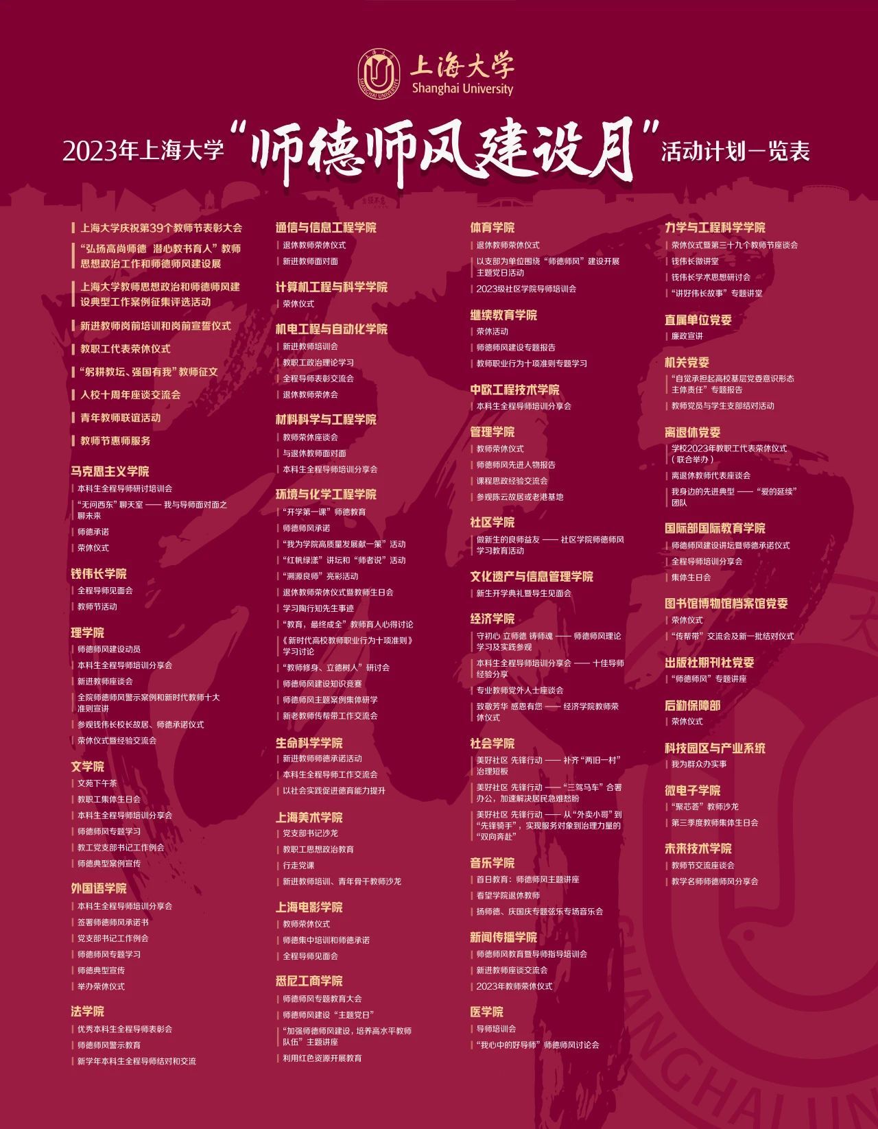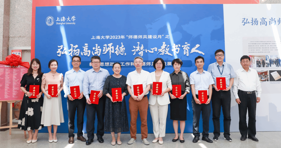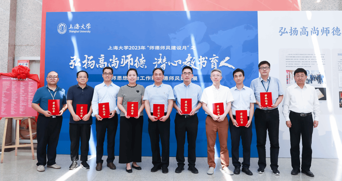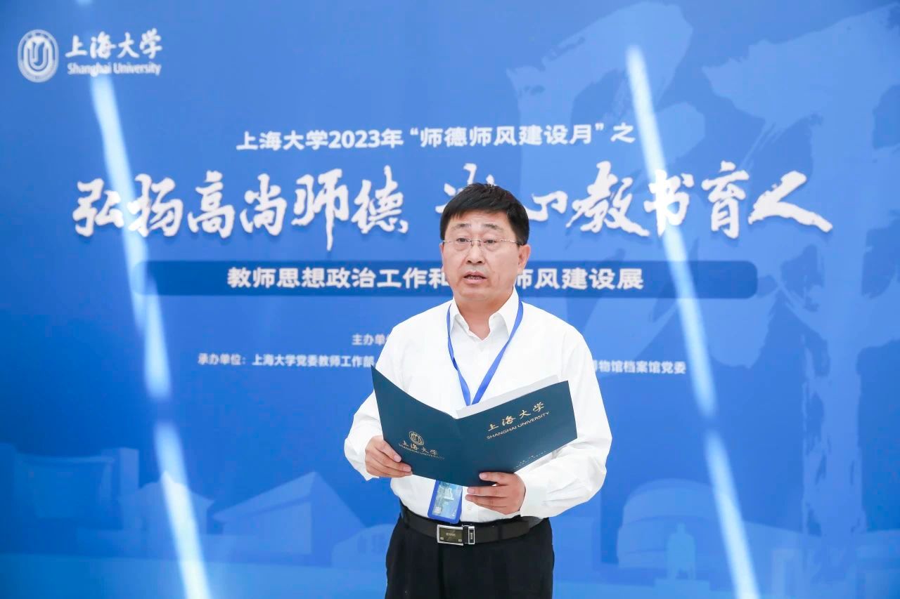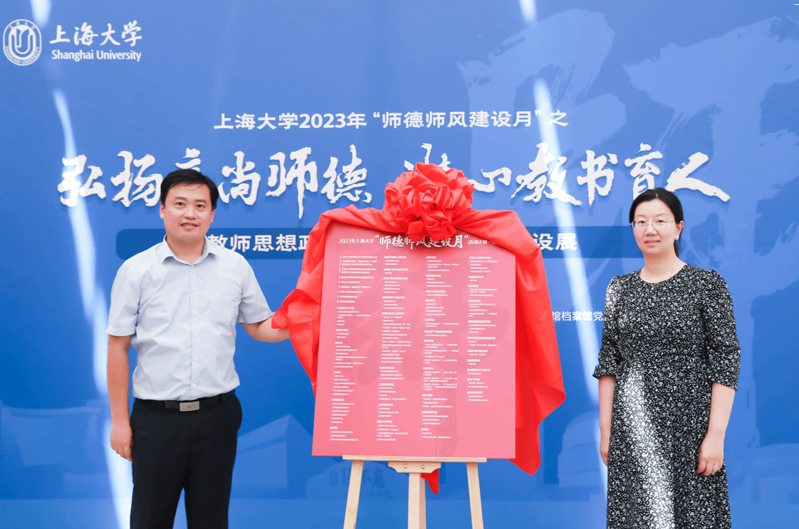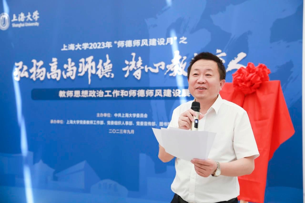 2023年9月10日是我国第39个教师节,也是党的二十大胜利召开后的第一个教师节。为贯彻落实《教育部关于做好庆祝2023年教师节有关工作的通知》和《中共上海市教育卫生工作委员会 上海市教育委员会关于做好庆祝2023 年教师节暨师德师风建设月活动有关工作的通知》要求,进一步加强教师思想政治工作和师德师风建设,Beat365唯一官方网站2023年“师德师风建设月”启动仪式暨“教师思想政治工作和师德师风建设展”于9月8日下午在图书馆二楼展厅举行。校党委副书记欧阳华,校党委常委、党委宣传部部长胡大伟,校党委常委、组织人事部常务副部长、组织处处长沈艺,党委教师工作委员会成员单位及各二级单位党委共同出席本次活动。启动仪式由党委教师工作部部长曹为民主持。