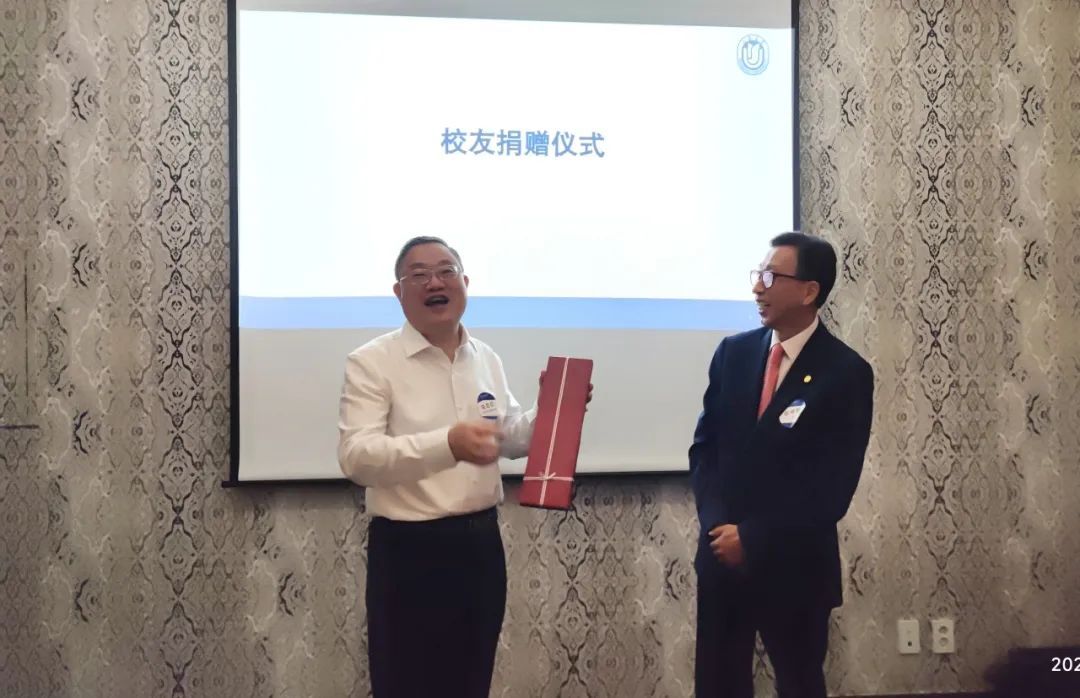 郭甲烈名誉会长还代表韩国校友会向母校转赠了礼物。成旦红书记代为接收并回赠校友校徽及纪念品。
