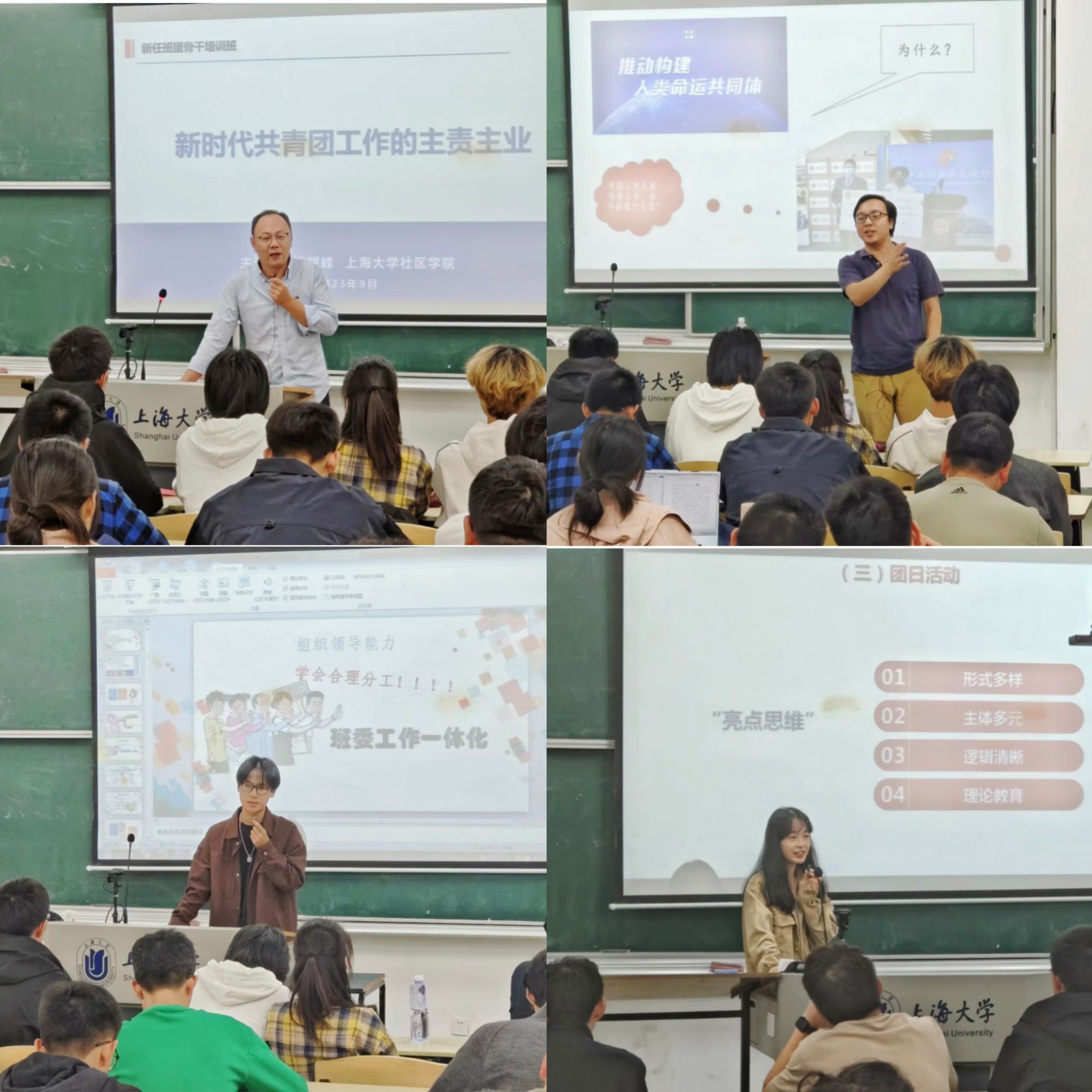 9月23日,班团骨干们集中进行了6学时理论学习、5学时红色教育、4学时基础团务和3学时能力提升的培训课程,形式包含理论学习、领导力课程、红色主题素质拓展和自主研习等。在理论学习环节,社区学院研究发展中心主任陆耀峰围绕“新时代共青团的主责主业”做专题报告,复旦大学马克思主义学院副研究员杨军带来主题讲座“经典中的马克思主义世界观和方法论”;在领导力课程中,原社区学院2022级十佳卓越班长、理工一类19班的张若禺和社区学院2022级十佳团支书、人文大类4班的李兰忻分享了自己的班团建设经验;在自主研习环节,各小组围绕党的二十大与团的十九大相关专题自主开展理论学习。