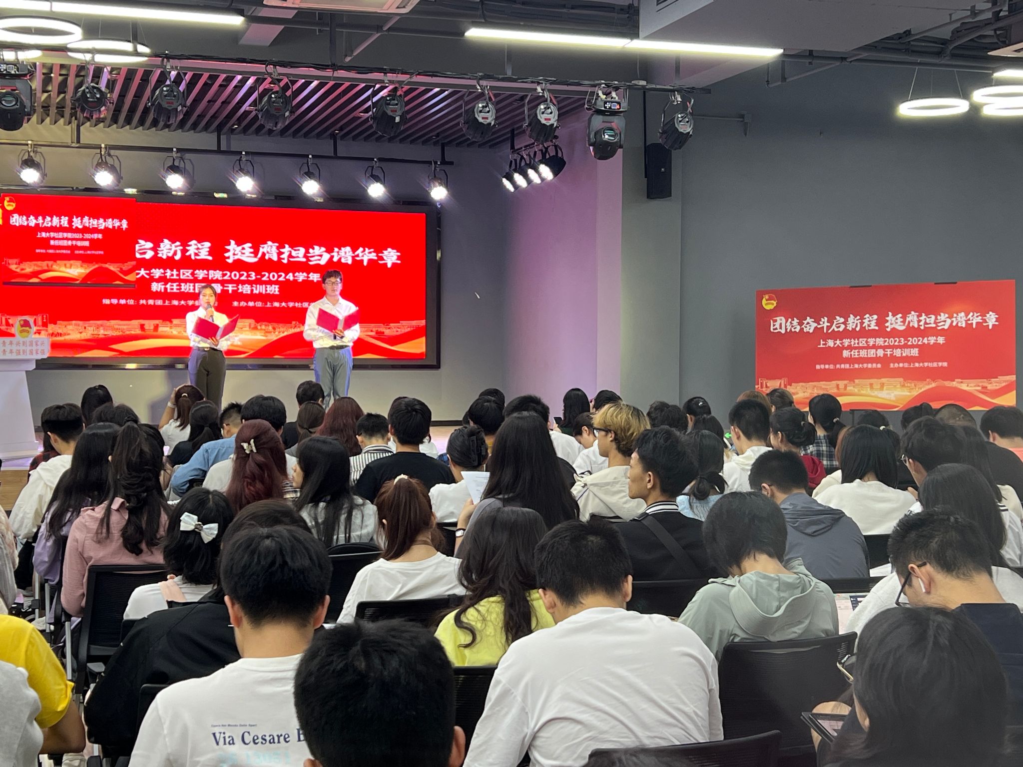 9月22日晚,2023-2024学年Beat365唯一官方网站新任班团骨干培训社区学院办学点开班仪式于Beat365唯一官方网站宝山校区学生创新创业实践基地309青春剧场举行。社区学院院长尹静波,社区学院党委副书记、副院长佟丽宁,社区学院团干部薛赛男、胡雅、廖香园、于亚静、薛卜真与135位班团骨干和29名推优一体化学生参加了开班仪式。