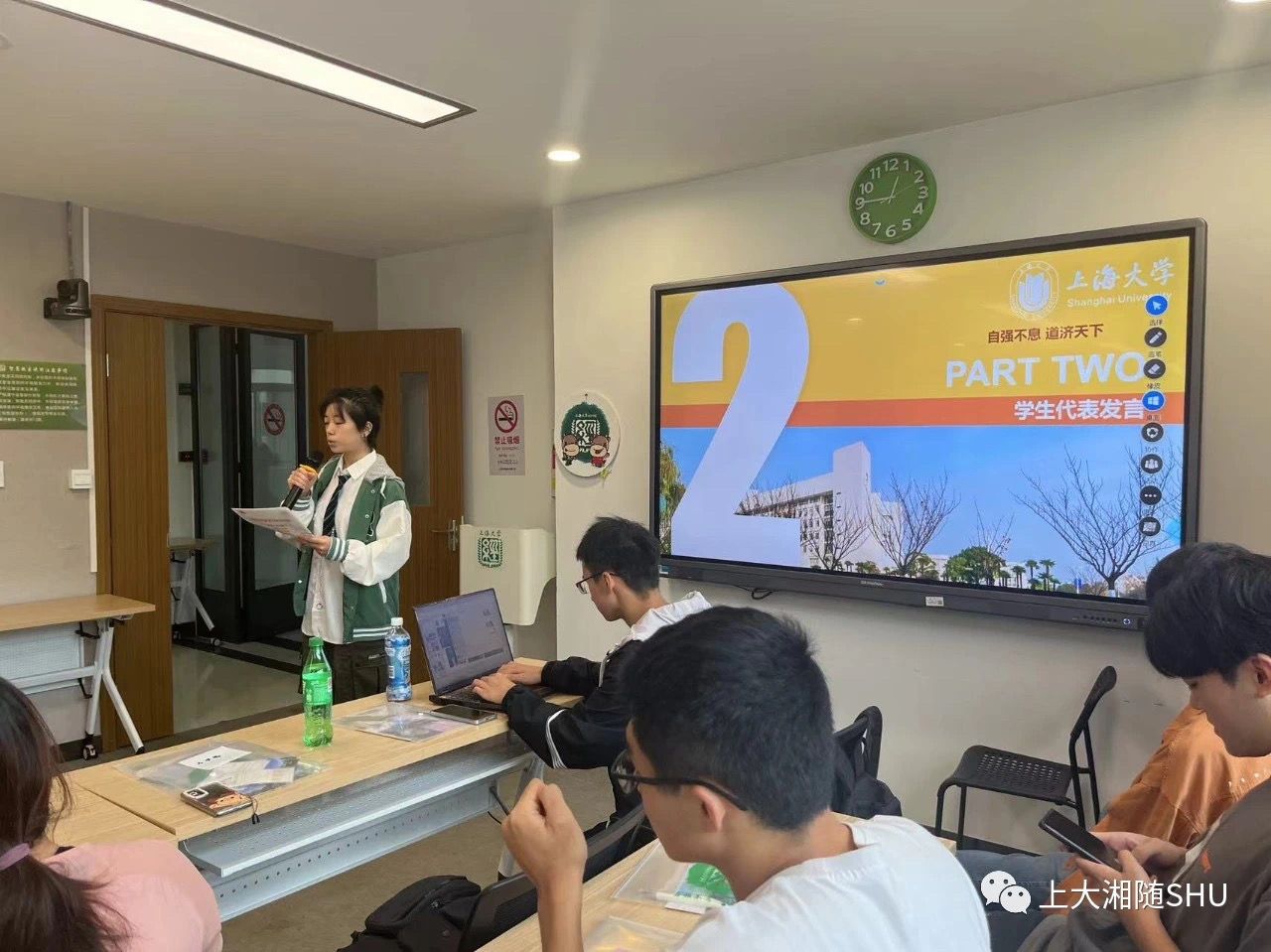 接着来自经济学院、长沙市第一中学的高年级学生代表贺泽楷发言,他从课内学习和课余生活两个方面向同学分享他的理解与经验,并给了湖南新生一些关于大学规划的小建议。而后是来自社区学院人文大类、长沙市南雅中学新生谷伊瑞同学进行了富有激情的演讲,一句“走遍六个食堂找不到一道正宗的湖南辣菜”将现场气氛迅速活跃了起来。