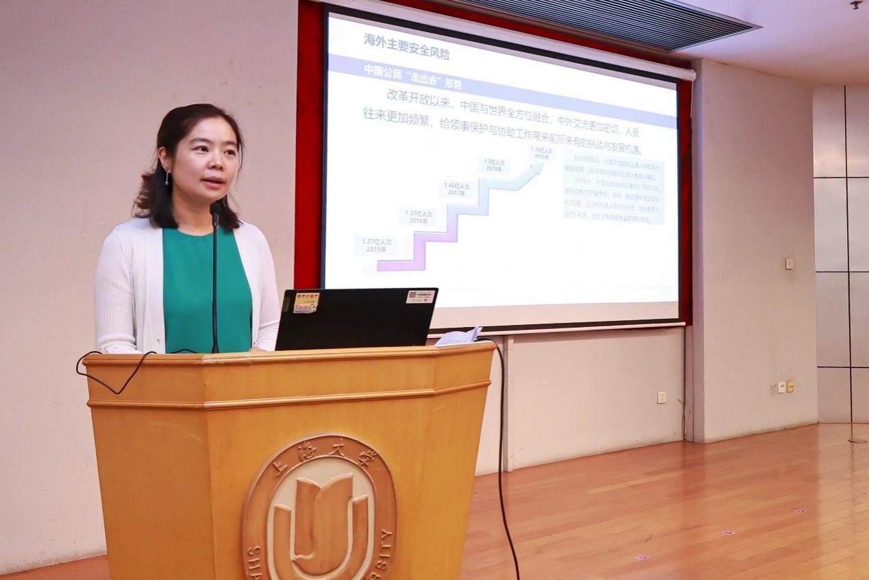 随后,领事司一级调研员刘原媛为各位师生进行了题为“海外领保与安全”的知识讲座。刘原媛以丰富的经验和案例,向老师同学们介绍了境外领保的重要性,以及应对突发事件的应急处理方法。“有限的领事保护,无限的家国情怀”,十四字尽显领事机关对于身处海外师生的支撑与关怀。老师与同学们认真聆听并记录相关信息,提升自己的境外安全知识储备。