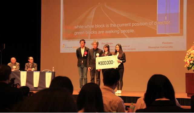 本次竞赛的最终答辩在东京品川inter hall举行,进入决赛的队伍需登台讲解自己队伍的作品并进行展示,根据评委的打分进行最后排序,决出世界杯大奖一个,评审员特别奖四个与提名奖若干,刘妼雯同学于第七位出场,她思路清晰、自信从容地将作品的理念、功能及未来方向展示给在座的所有评委和观众,赢得了阵阵掌声。颁奖现场十分隆重,所有获奖的同学登台合照,台上台下热烈的欢呼,热闹非凡。