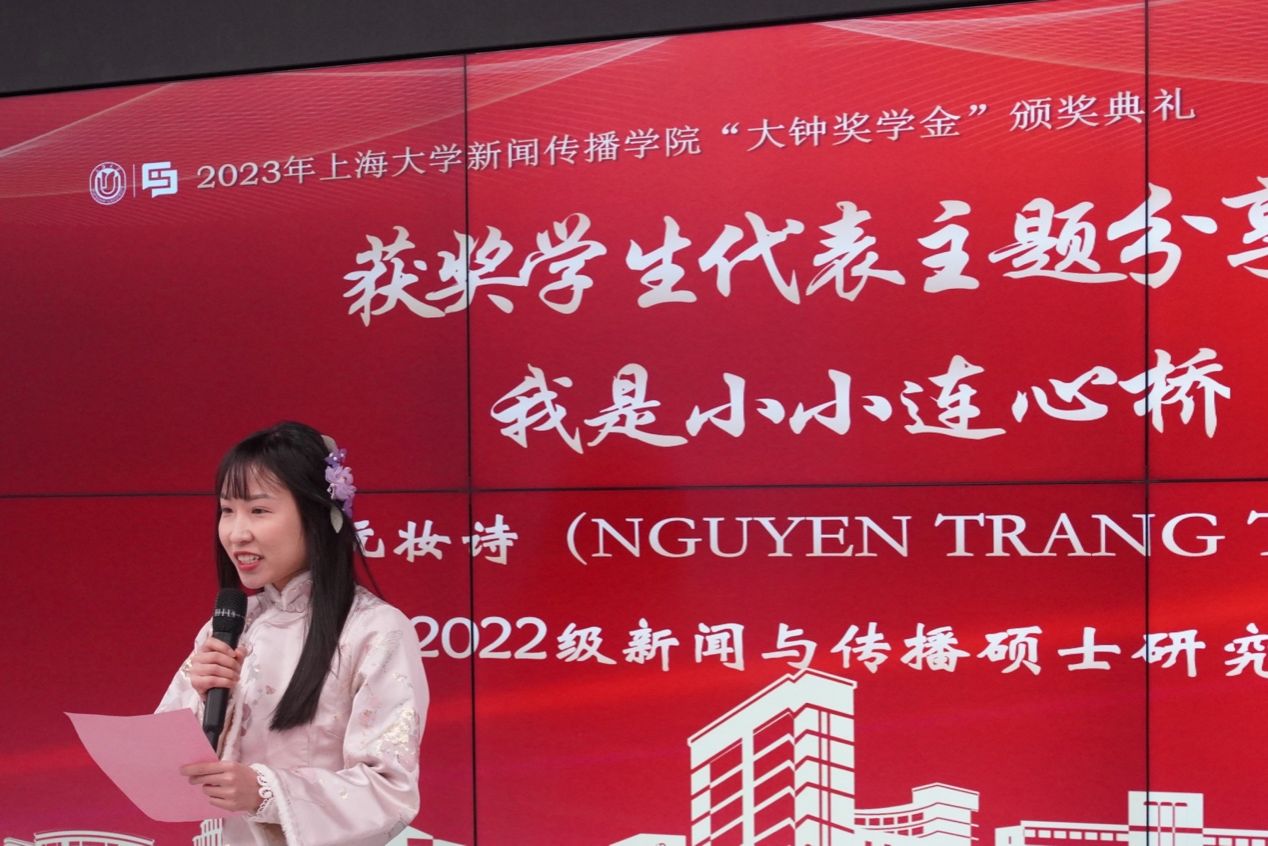 本届“大钟奖”也首次有国际留学生获此殊荣,来自越南的2022级硕士研究生阮妆诗分享了她来到中国后学习中文和做视频博主的成长经历,在不断进行视频创作传播的过程中,收获了越来越多中国和越南粉丝,也逐渐成为一座连接两国友谊的小桥。