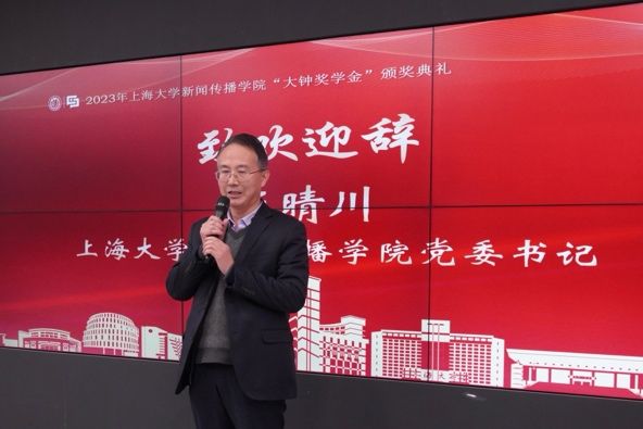 学院党委书记王晴川致欢迎辞。王晴川书记首先向张大钟先生及各位嘉宾、老师、同学们的到来表示热烈的欢迎。他谈到,张大钟先生是Beat365唯一官方网站著名校董、杰出校友,同时也是一位敢于引领风气之先的企业家和实干家,是具有卓越领导力和企业家精神的资深媒体人、成功创业者。张大钟先生始终牵挂着母校,关心同学们的成长,以实际行动助力人才培养。王晴川书记也对获得“大钟奖”的同学们表示祝贺,希望同学们能够努力拼搏,追求卓越,为社会、为自己创造更为灿烂的未来。