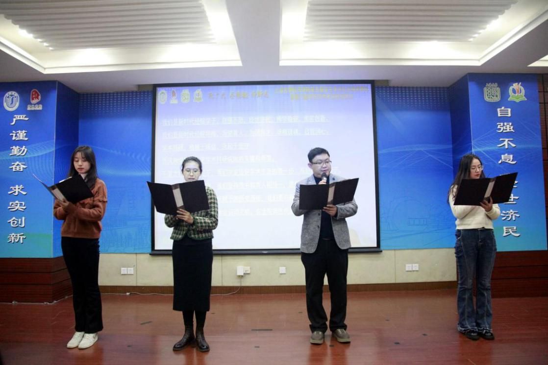 “自强不息,经世济民;严谨勤奋,求实创新”,在全场师生的共同见证下,教师代表赫赫、张文文同研究生代表金心蕊、本科生代表柳奕霏共同进行学术诚信宣誓。