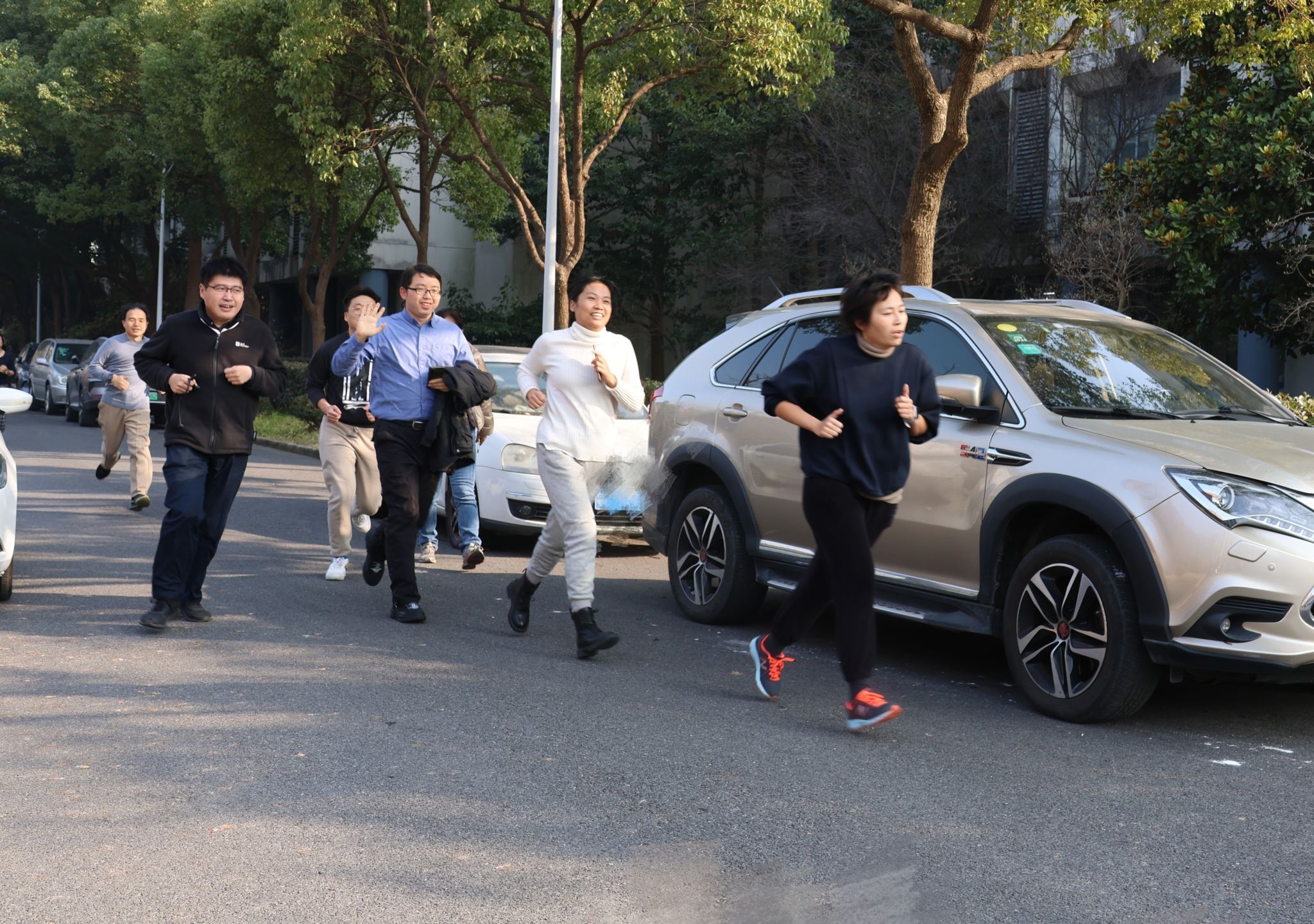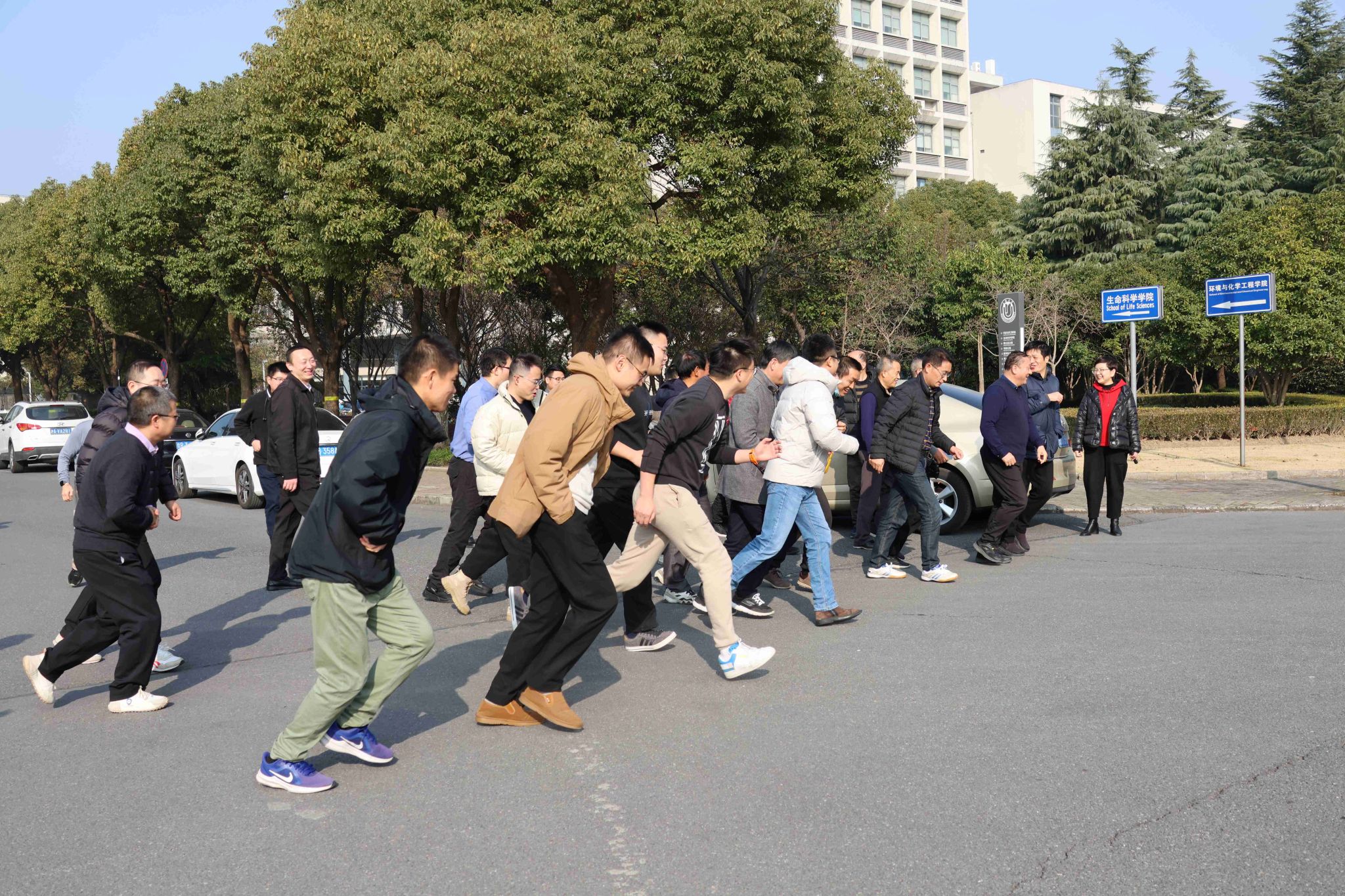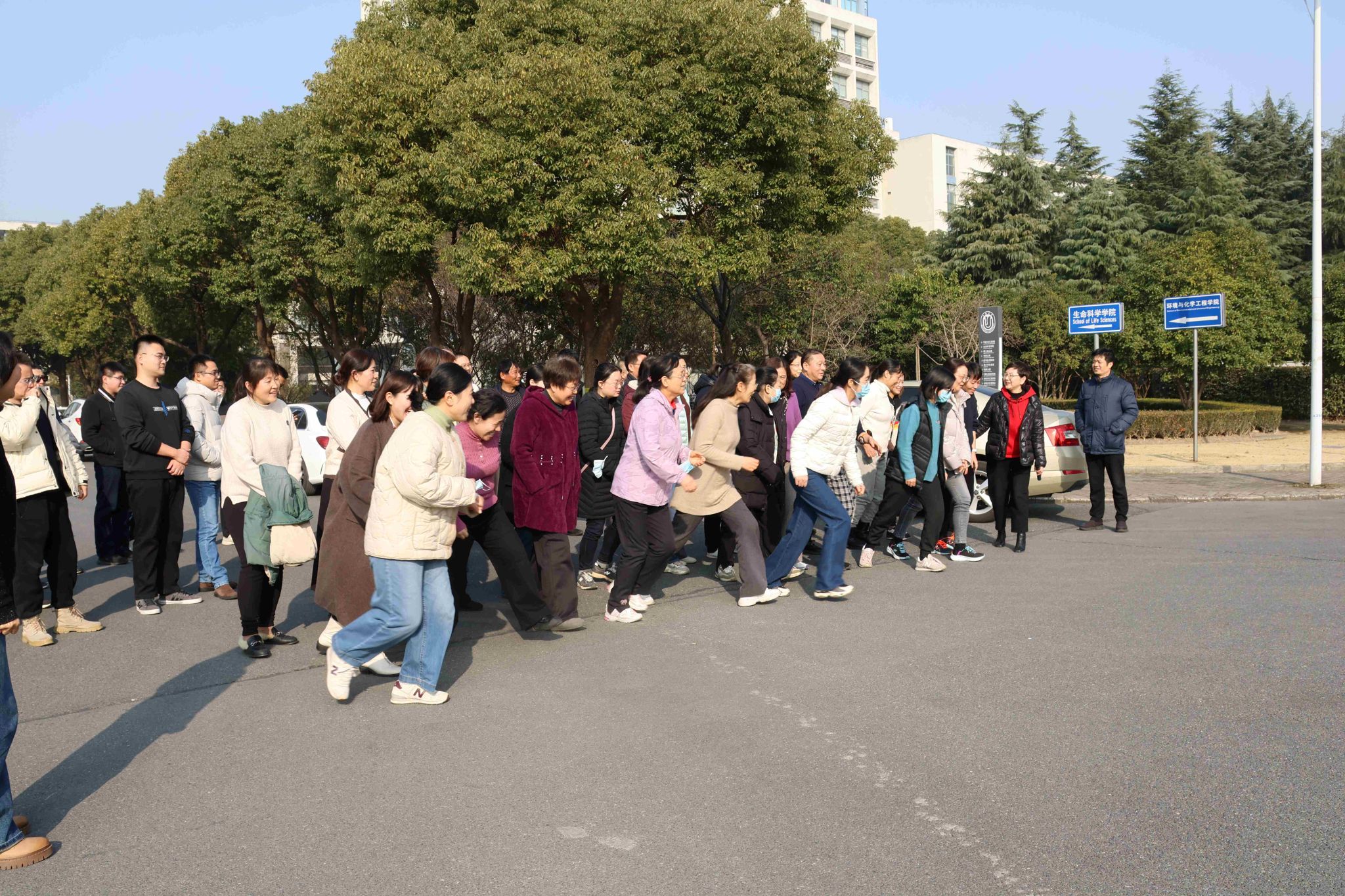 在“健身跑”环节,老师们自环化楼南侧路口出发,绕行18号楼、19号楼,沿着河畔一路向东,后经主路通道,返回至环化楼结束。奔跑途中,老师们共同感受冬日暖阳、振奋精神面貌。