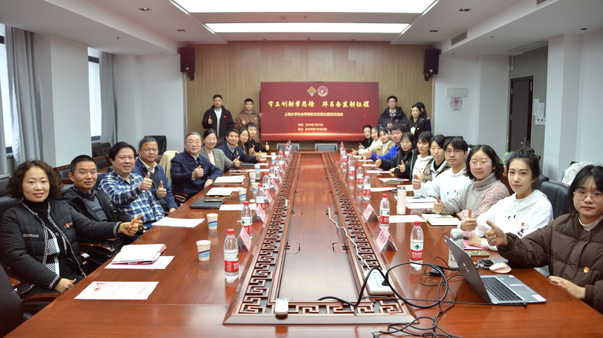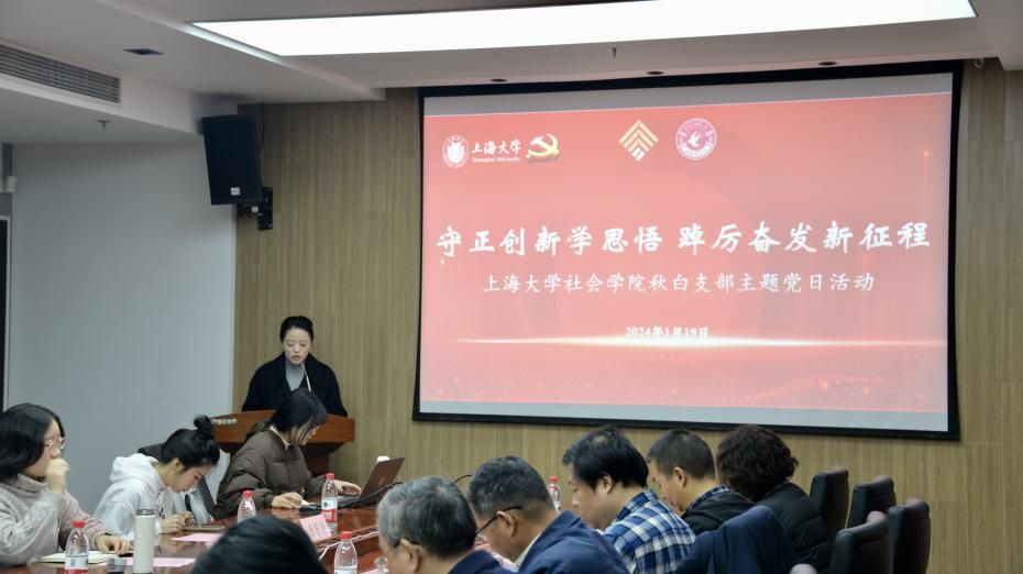 习近平总书记在发表2024年新年贺词时曾指出:“2023年,我们接续奋斗、砥砺前行,经历了风雨洗礼,看到了美丽风景,取得了沉甸甸的收获”。为全面贯彻落实党的二十大精神和二十届二中全会精神,2024年1月19日上午,社会学院秋白党支部开展“守正创新学思悟踔厉奋发新征程”主题党日活动,共同回顾支部过去一年的工作情况,展望未来的发展前景。校党委书记成旦红,校党委常委、组织人事部常务副部长、组织处处长沈艺,党政办公室副主任凌长臣,秋白书院院长肖瑛,社会学院领导班子成员,辅导员老师以及秋白党支部学生党员共同出席本次活动。活动由社会学院秋白党支部书记王达然主持。